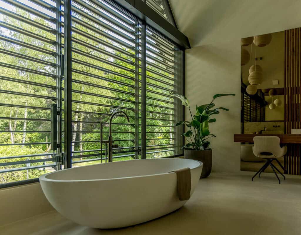 De lamel is 150 mm breed en 1,8 m dik. Sluit je de louvers volledig, dan vallen ze over elkaar. Er komt dan absoluut geen licht door.