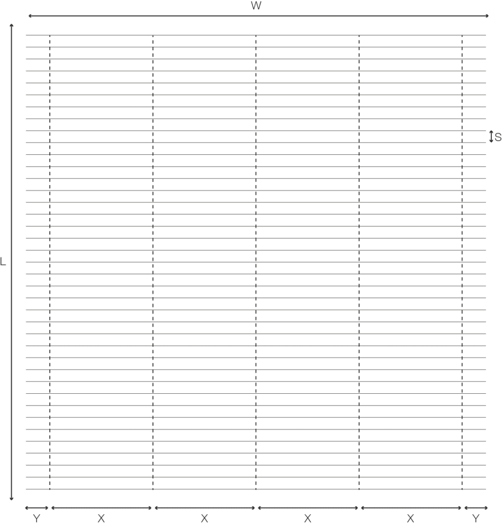 De maximale afstand tussen twee dragers (X) is 1200 mm en de maximale overhang (Y) is 300 mm. De overhang is breedte voorbij de buitenste drager. De lamel wordt daar maar aan een kant ondersteunt.