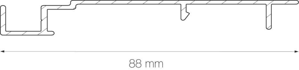 Hiernaast zie je een schematische weergave van een UNIQUE 88E lamellensysteem. Dit bestaat uit minimaal twee dragers en een aantal lamellen.
