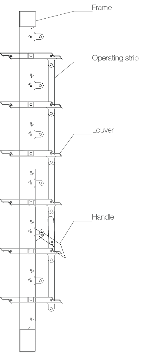 De lamellen zijn verbonden met een operating strip. Hiermee kunnen de louvers synchroon kantelen of in eenzelfde hoek worden geplaatst.
