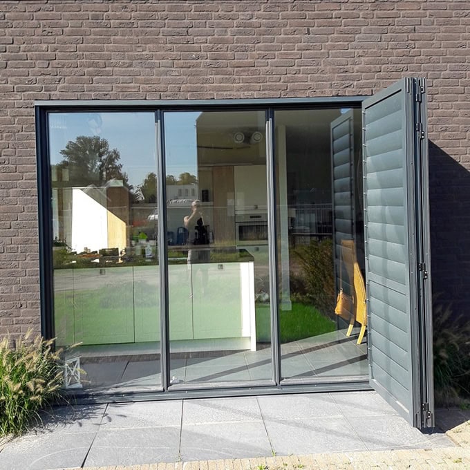 Bij deze residentie in Eersel zijn meerdere ramen en deuren voorzien van vouwwanden. Een vouwwand is een uitstekende oplossing voor een schuifpui of een glaswand. Compact weg gevouwen naar één of twee zijden is doorkijk én doorloop maximaal.