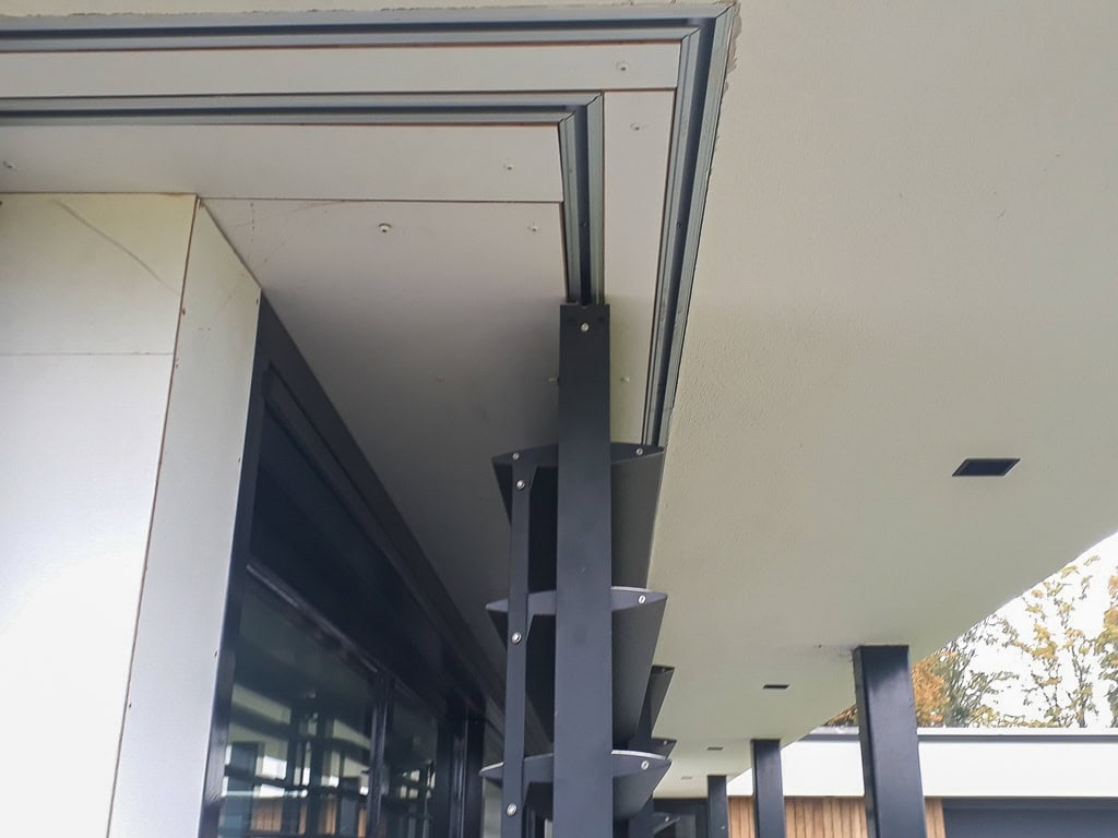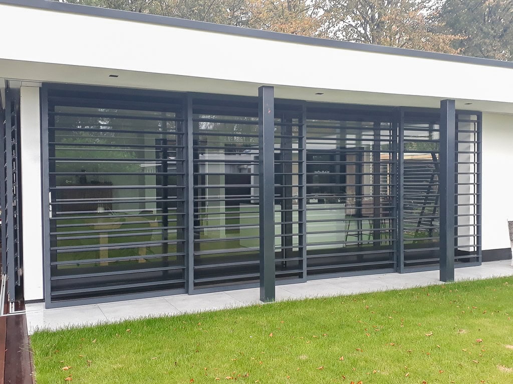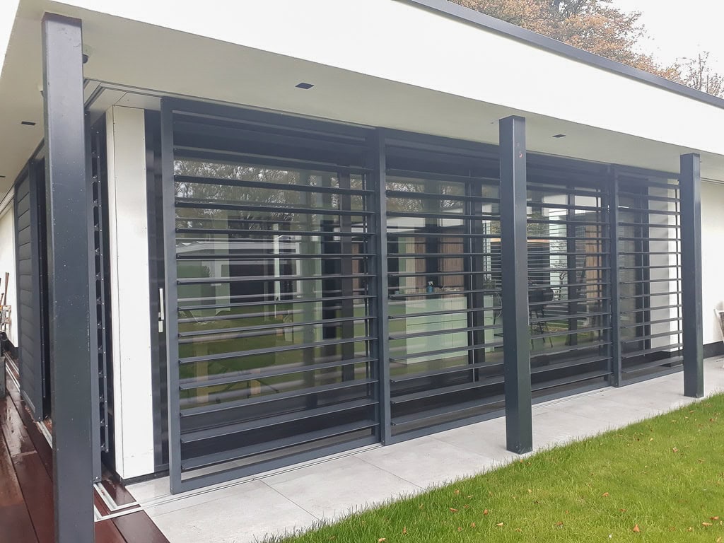 Bij deze residentie in Delft zijn outdoor shutters in een schuifrail systeem geplaatst. De rails zijn ingebouwd in de overstek en vloer en mooi afgewerkt. De schuifpanelen met ellipsvormige lamellen kunnen op de elke gewenste positie worden vastgezet met een espagnolet fixering.