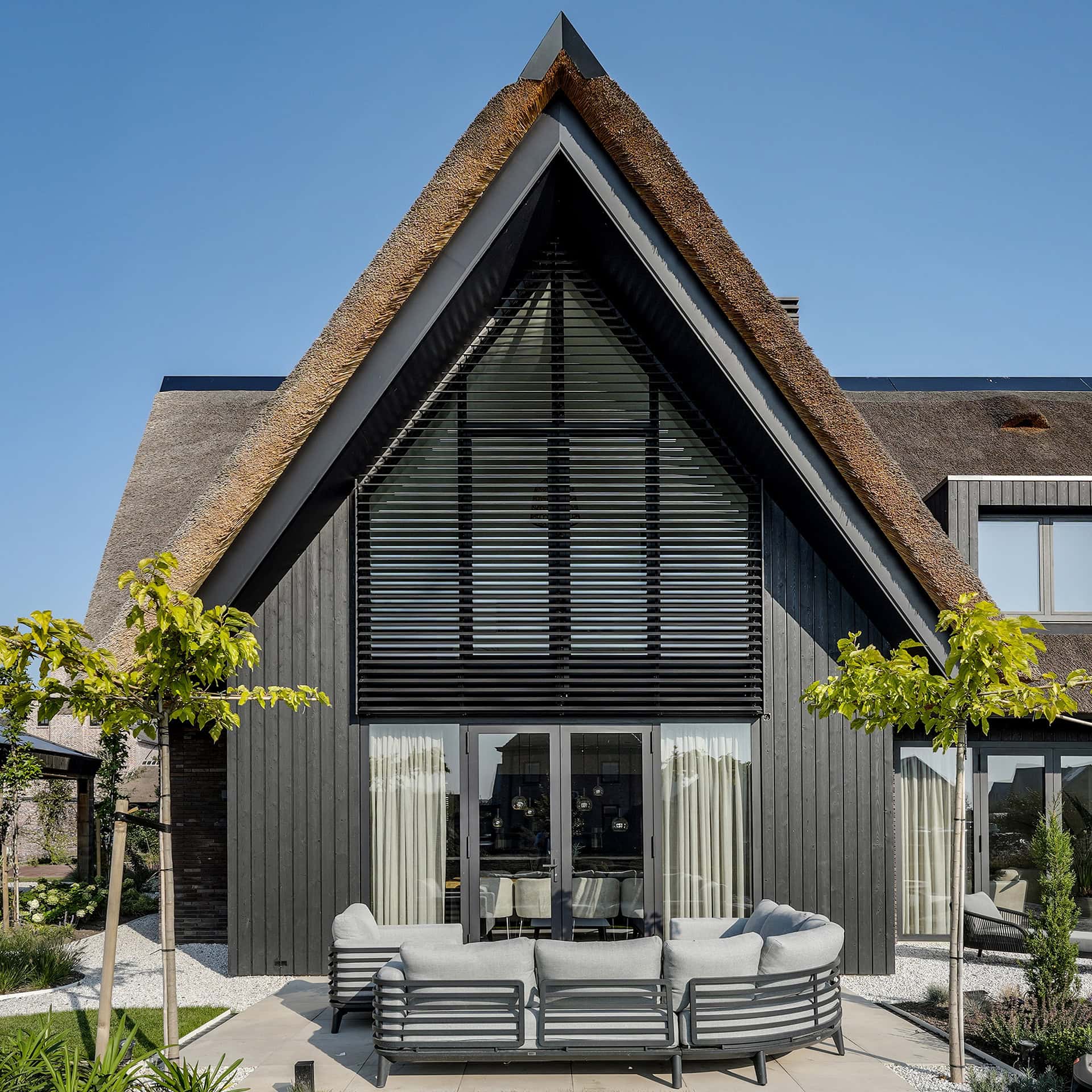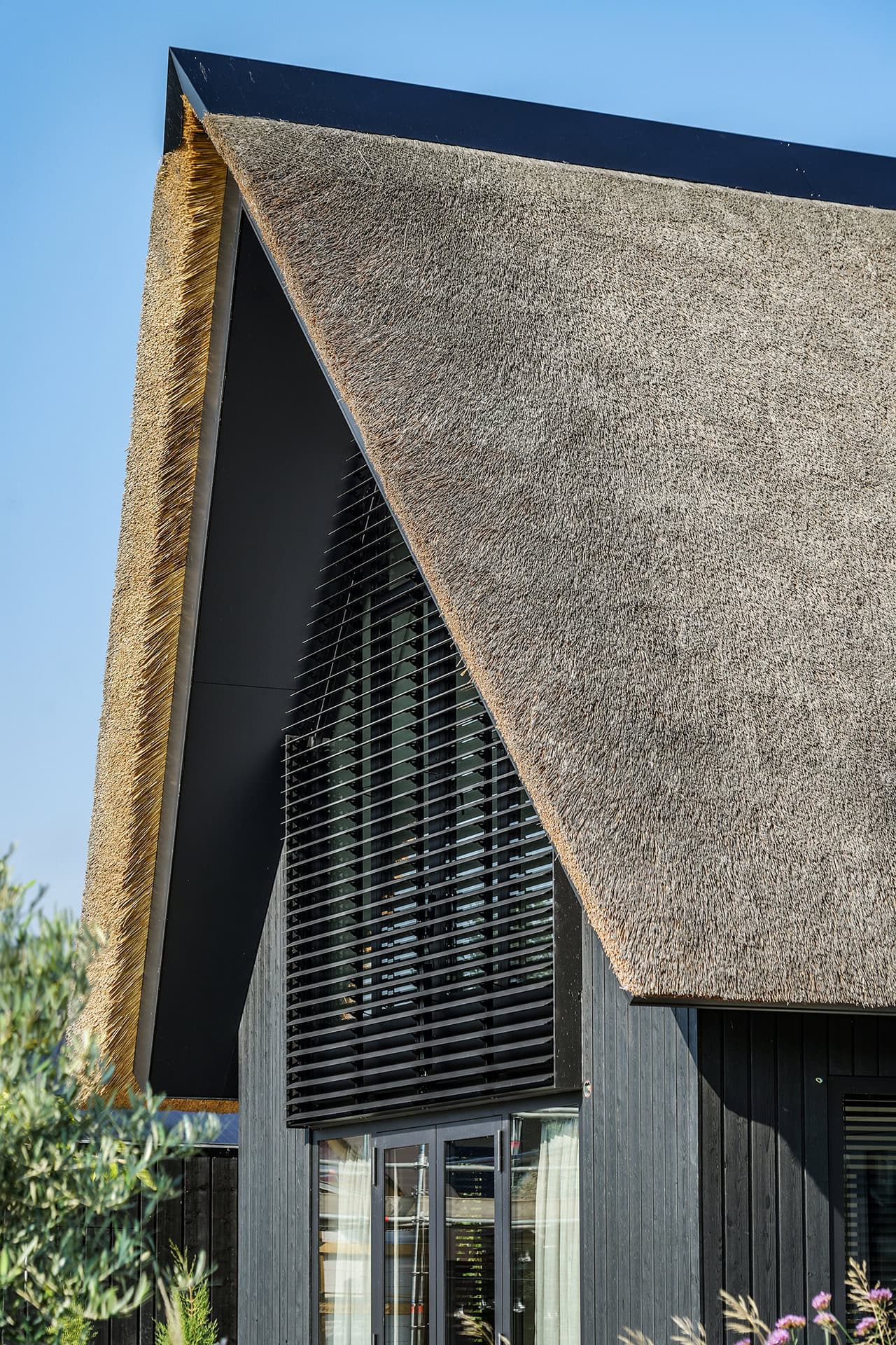 Het lamellensysteem begint aan de basis als een rechthoek. Halverwege gaat de vorm over in een driehoek, waarvan de punt eindigt in de nok van het dak. Openen en sluiten gaat via domotica.