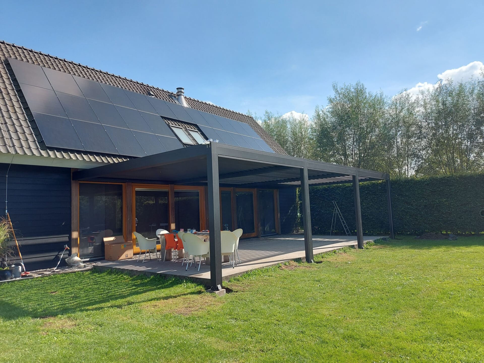 Een klassieke woning koos ervoor om een terras van 12 x 6,5 meter lang te overkappen met een lamellendak. Hiervoor hebben we als oplossing gekozen voor 3 lamellendaken van elk 4 meter breed die elk afzonderlijk te bedienen zijn.