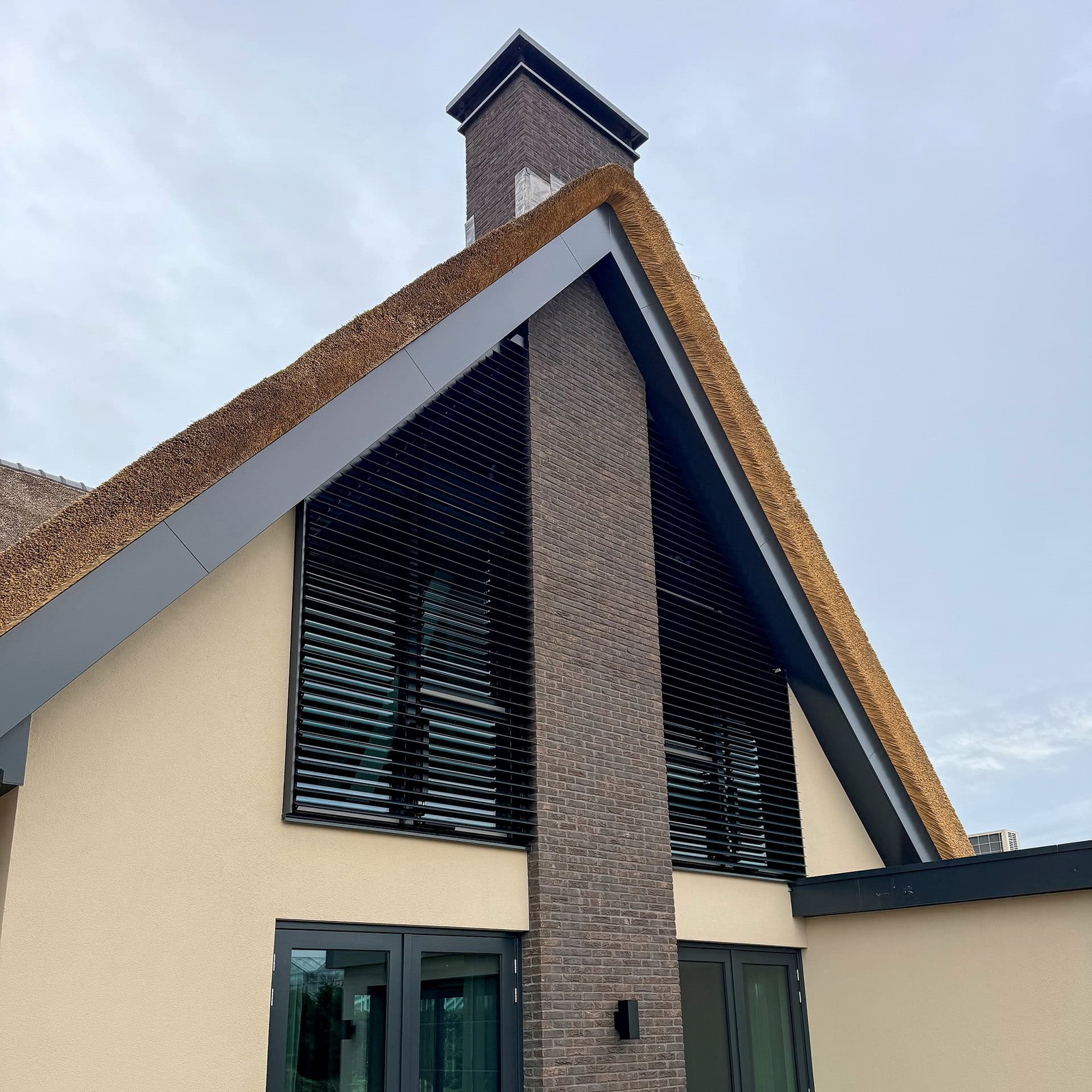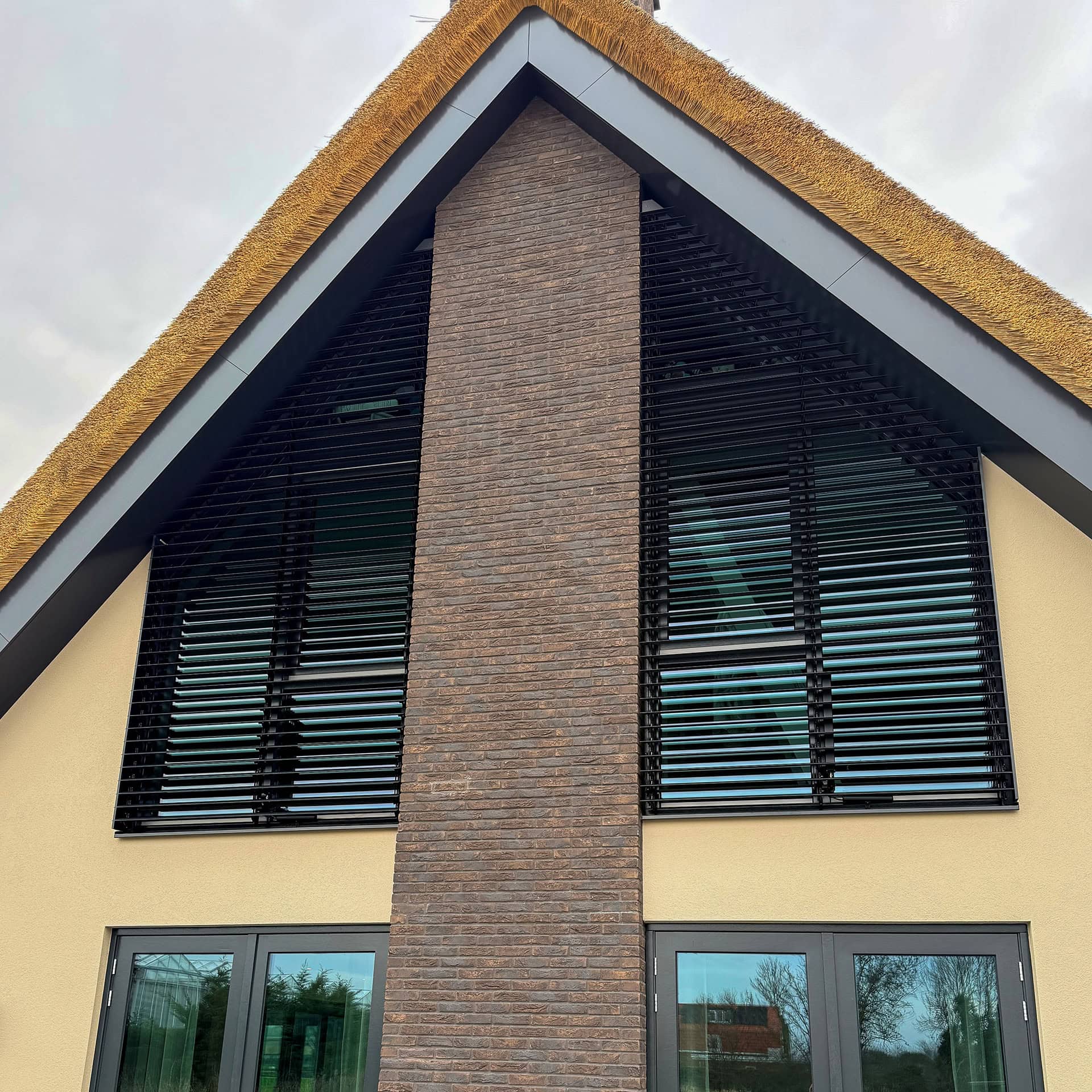 Een moderne villa in Bergschenhoek is in opdracht van Aannemingsbedrijf Groenewegen voorzien van vier lamellensystemen met de UNIQUE 96E . De louver systemen beginnen alle vier aan de basis als een rechthoek, maar gaan eindigen vervolgens in de nok van het dak. Al zijn ze allemaal anders van vorm, de beweegbare lamellen volgen strak de contouren van de overstek.