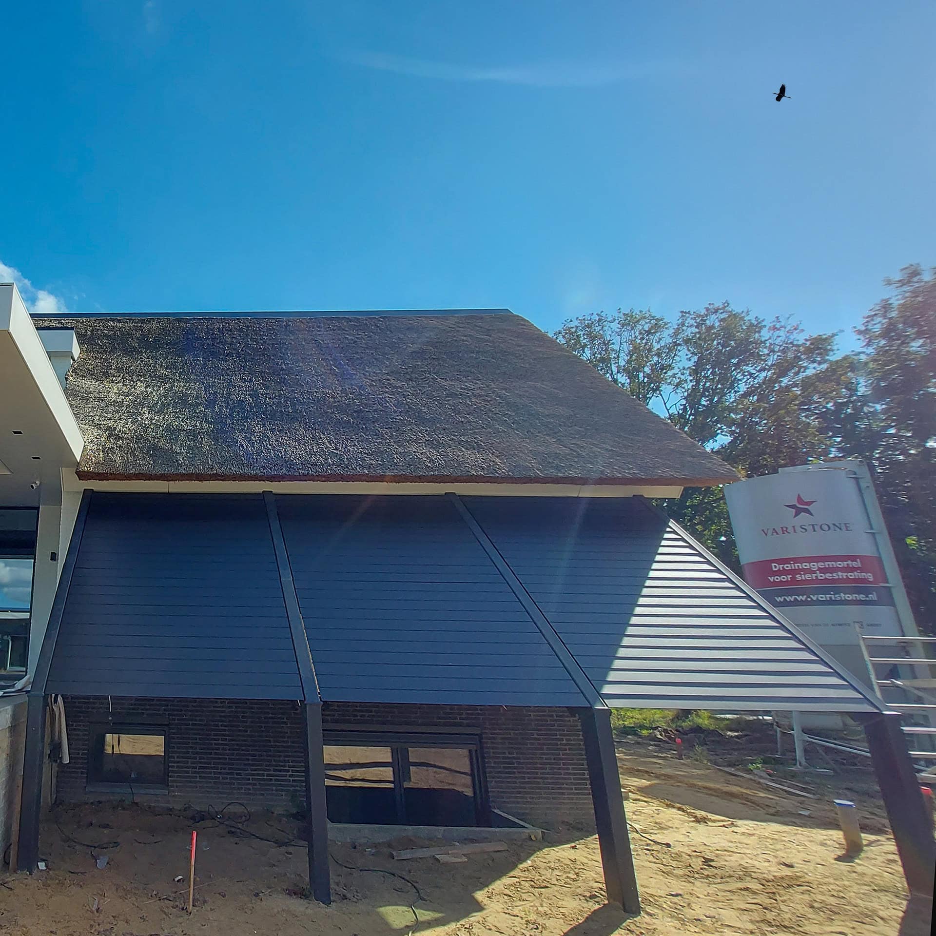 Links hiervan, eveneens aan de achterzijde, bevindt een verhoogd terras. In de overkapping hiervan is een Quadro lamellendak ingebouwd. Dit louverdak heeft een geïntegreerde hemelwaterafvoer.