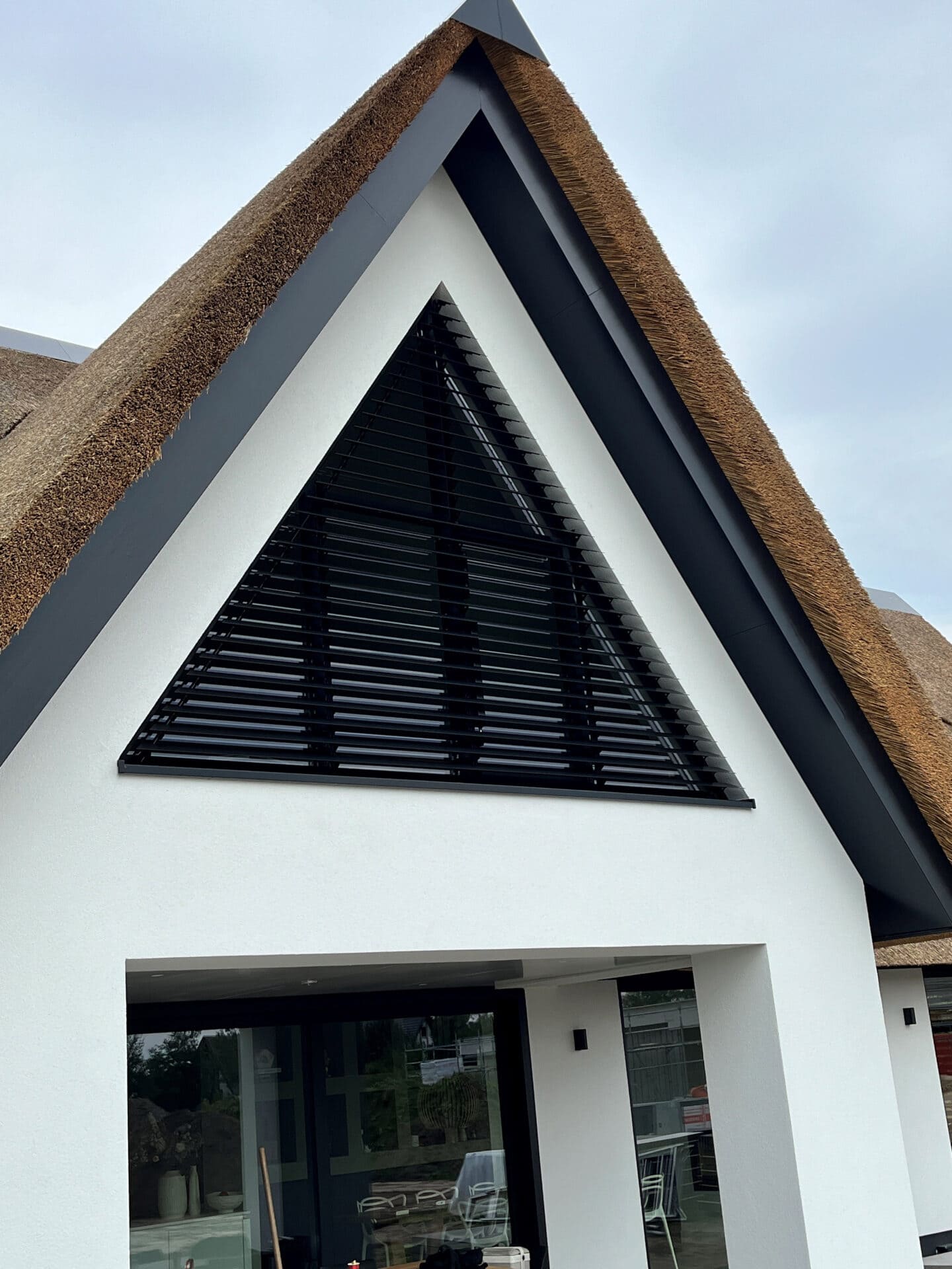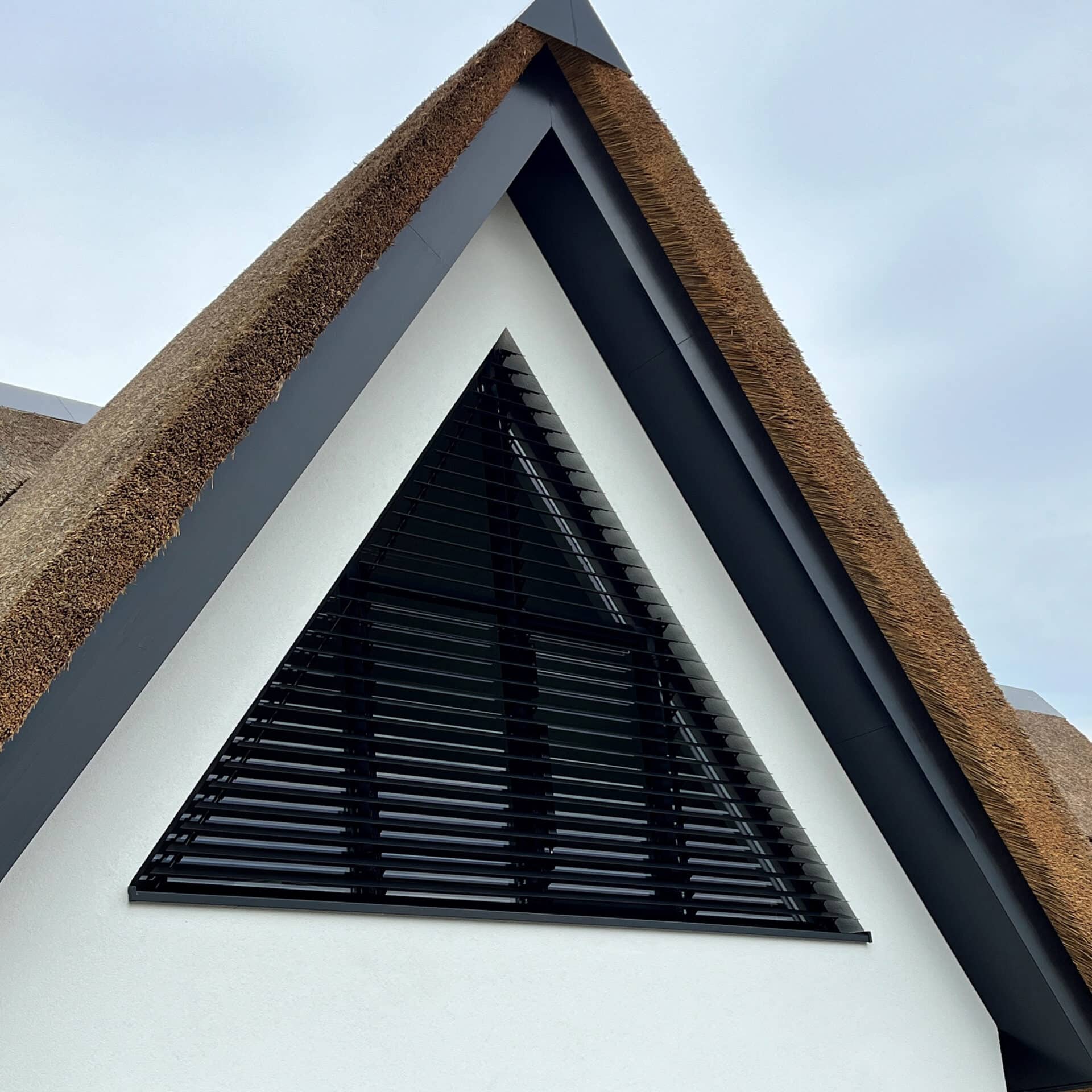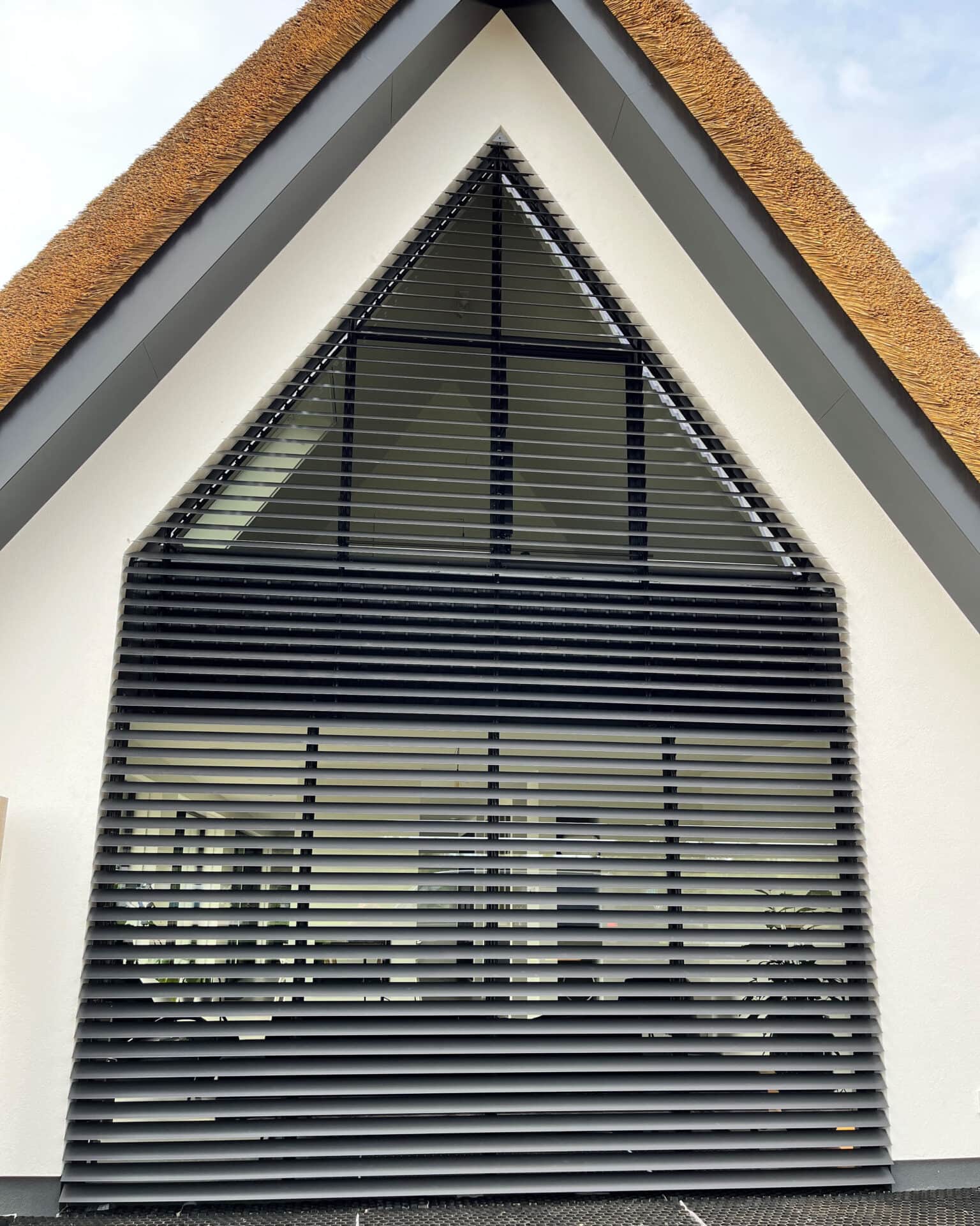 Tenslotte is ook in de punt van het asymmetrische bijgebouw een lamellensysteem geplaatst. Ook dit louver systeem volgt de atypische contouren van het raam.