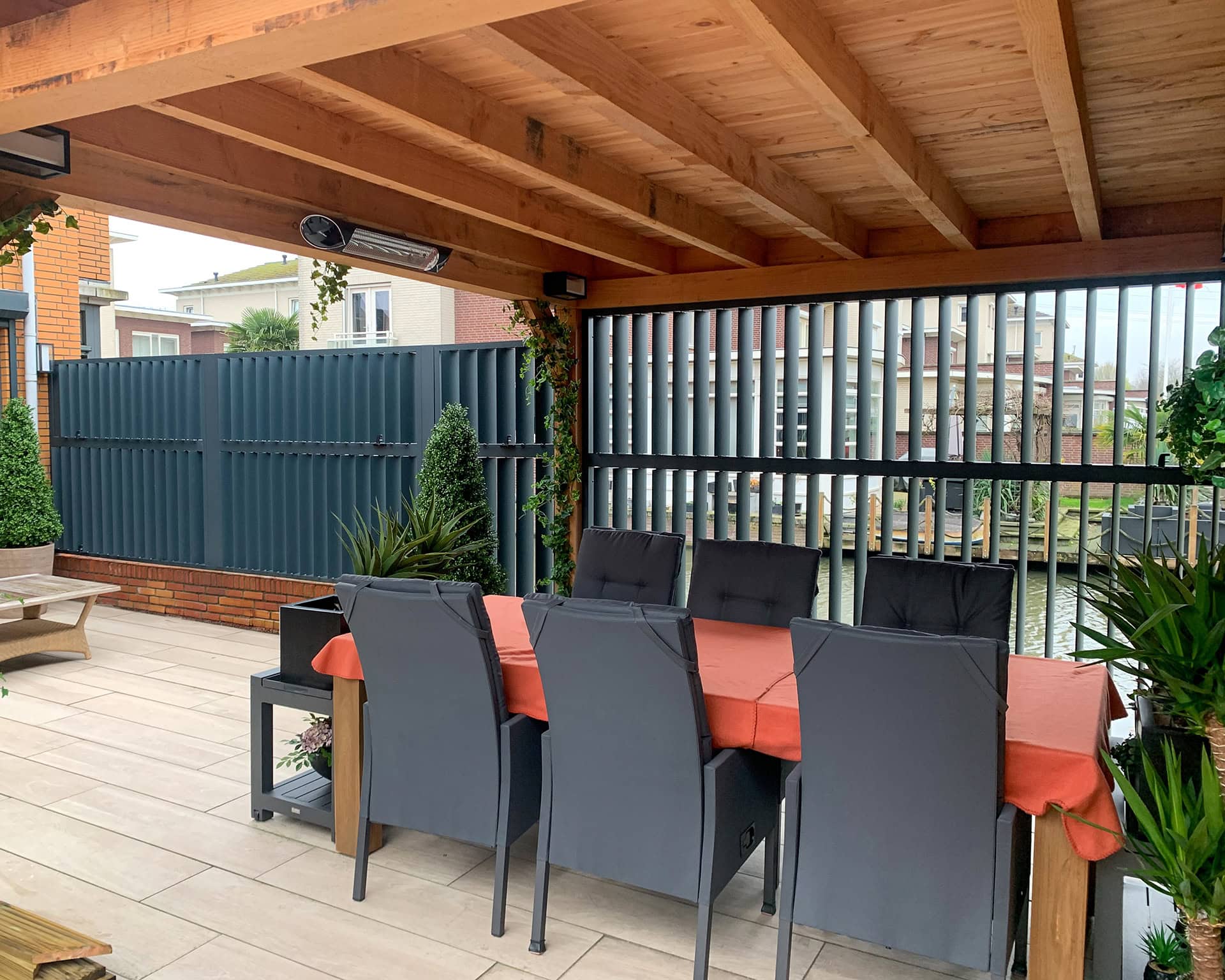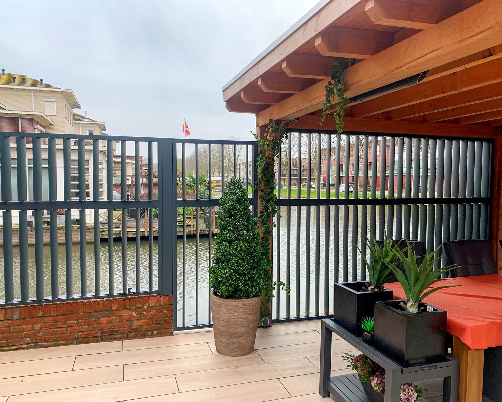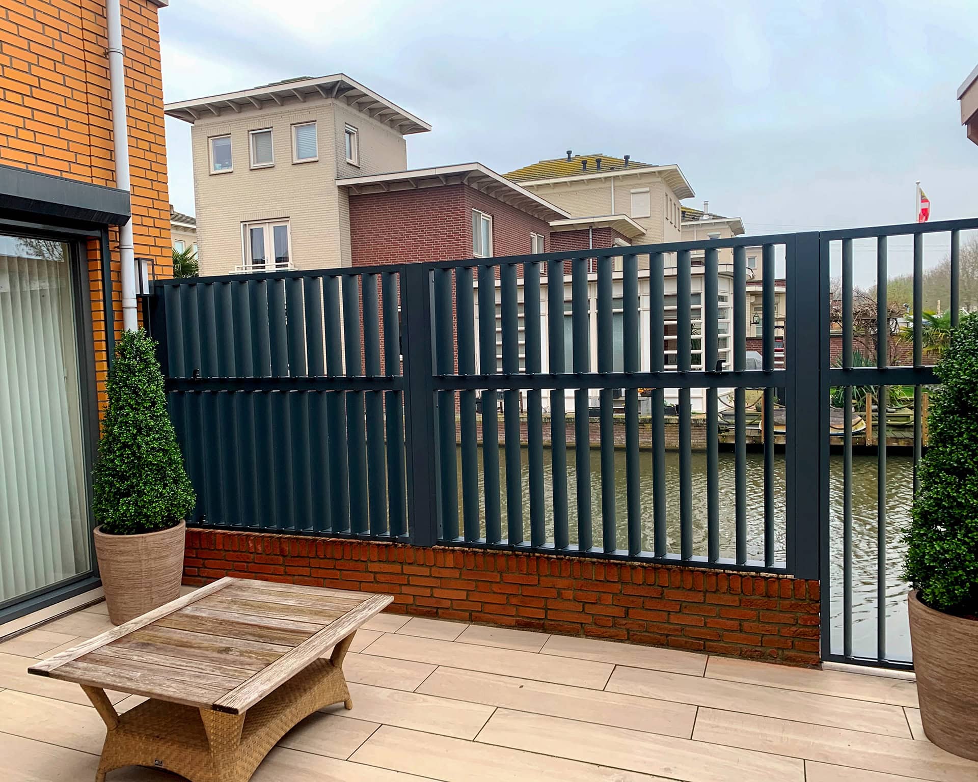 Met verticale lamellen is een multifunctionele schutting aan de waterkant gecreëerd. Wil je privacy omdat er teveel pleziervaartuigen voorbij komen of staat er een stoffige wind, dan sluit je de verticale louvers. De poort die toegang biedt tot de steiger is keurig uitgelijnd met de panelen aan de linker en rechter kant. Het complete project is uitgevoerd in RAL 7016 met fijnstructuur.