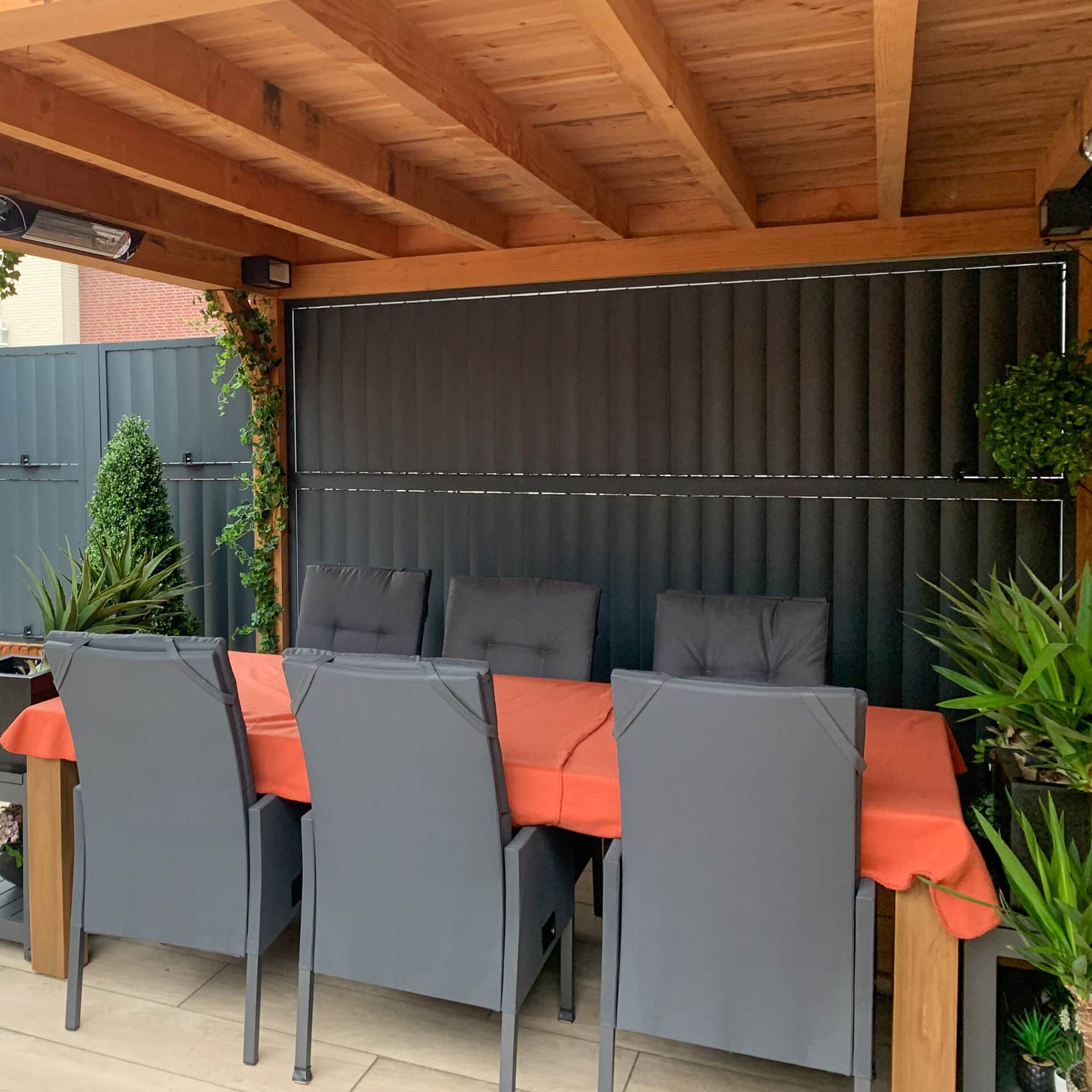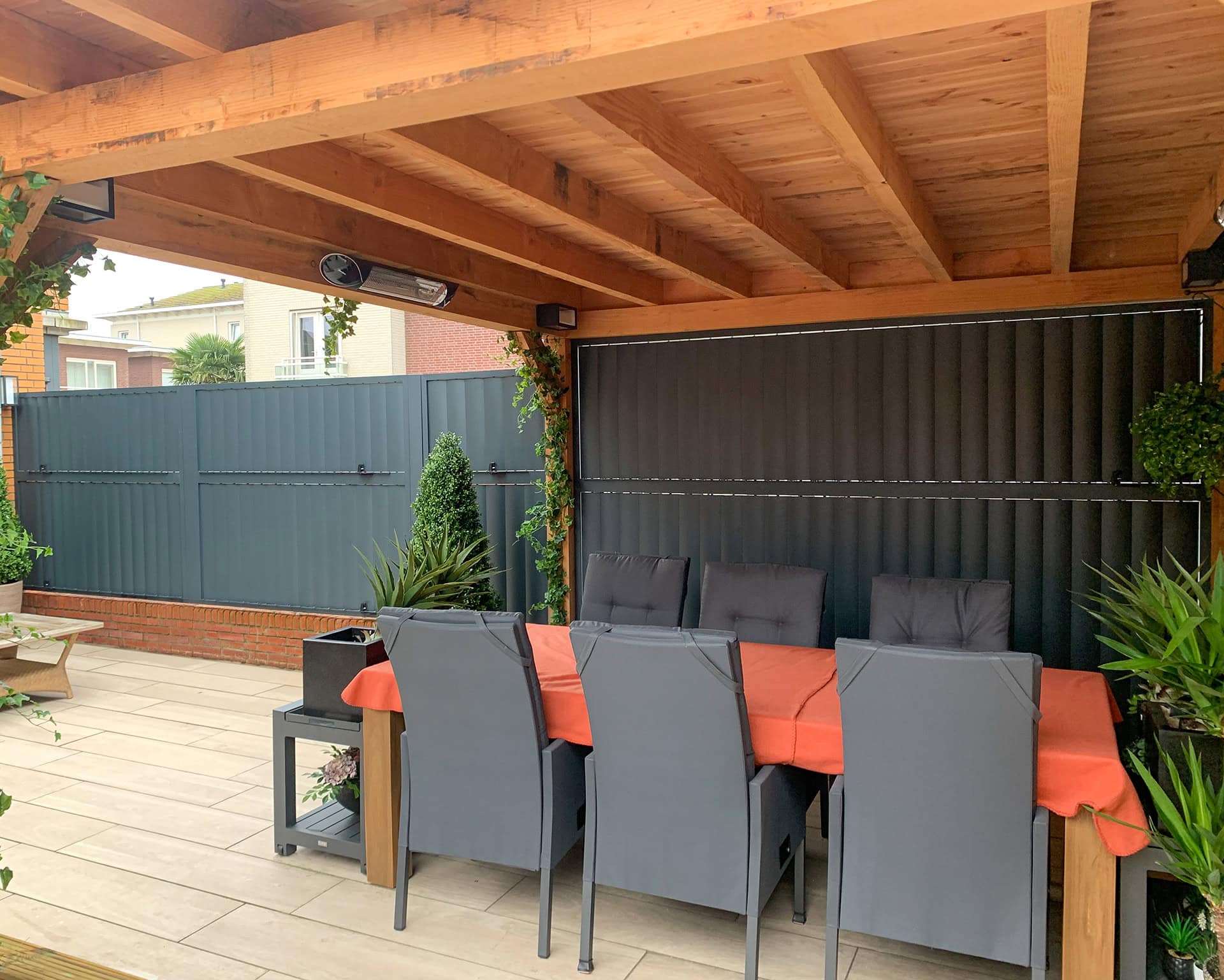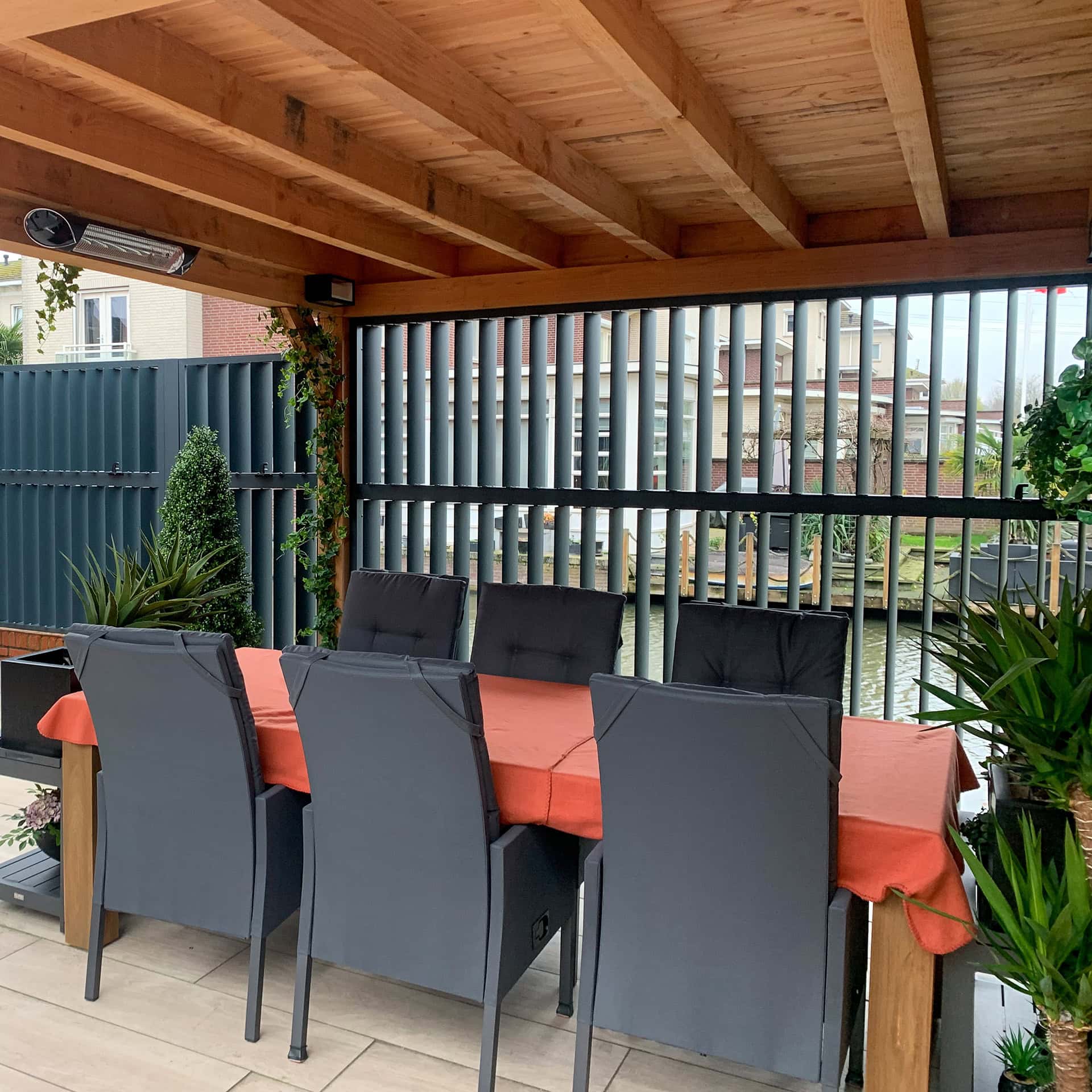 Met verticale lamellen is een multifunctionele schutting aan de waterkant gecreëerd. Wil je privacy omdat er teveel pleziervaartuigen voorbij komen of staat er een stoffige wind, dan sluit je de verticale louvers. De poort die toegang biedt tot de steiger is keurig uitgelijnd met de panelen aan de linker en rechter kant. Het complete project is uitgevoerd in RAL 7016 met fijnstructuur.