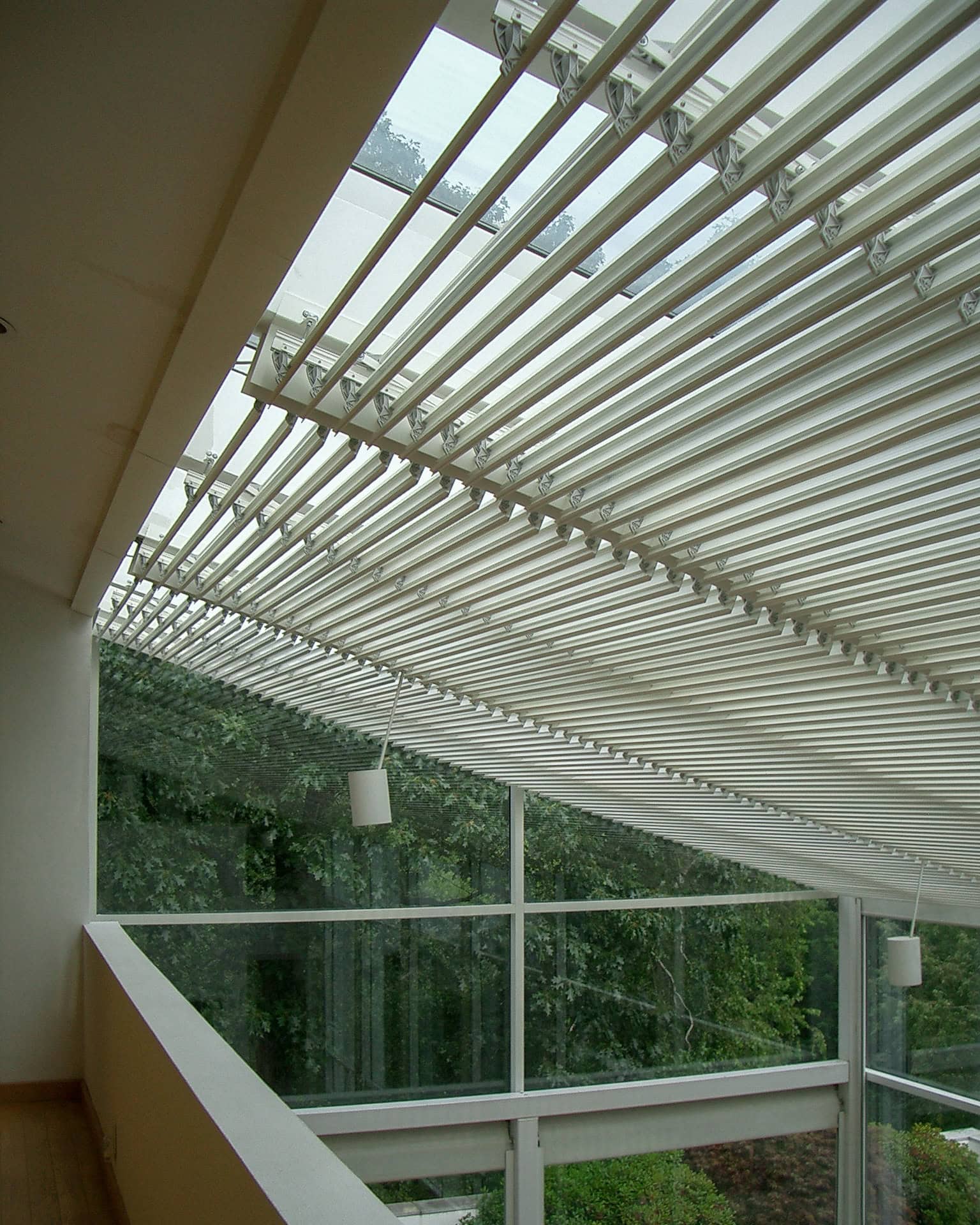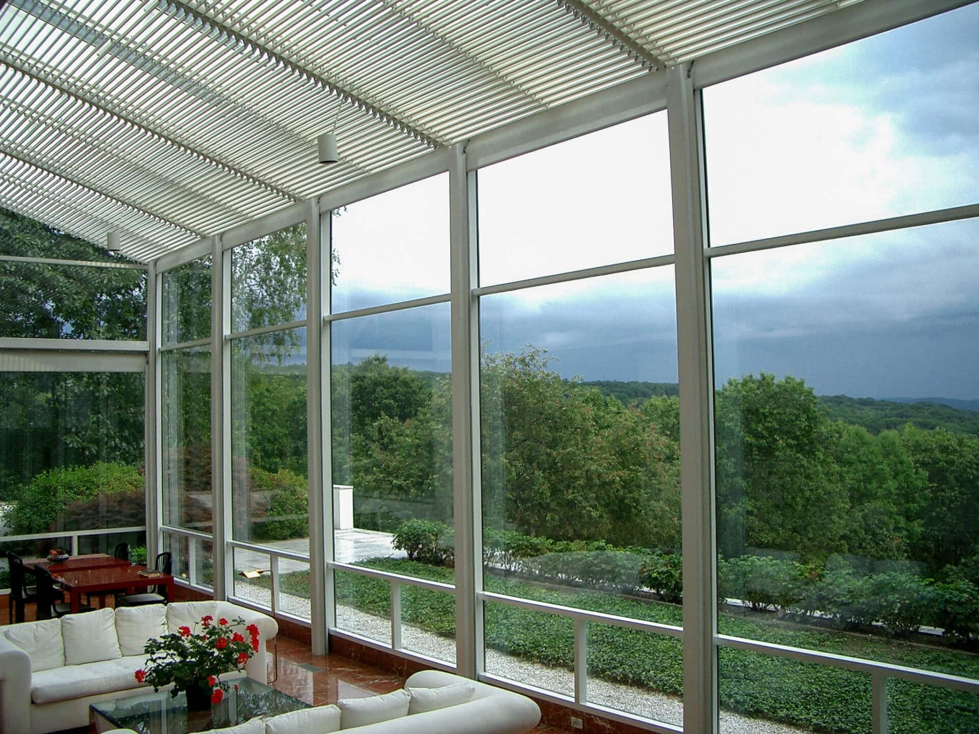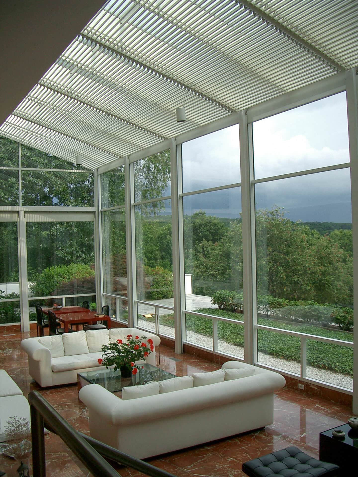 In opdracht van deze architect is het grote glasdak van de serre aan de binnenzijde voorzien van kantelbare lamellen. De gebruikers zetten de lamellen eenvoudig in elke gewenste stand tussen helemaal open en helemaal dicht. Op deze wijze reguleren zijn inkomend zonlicht en -warmte.