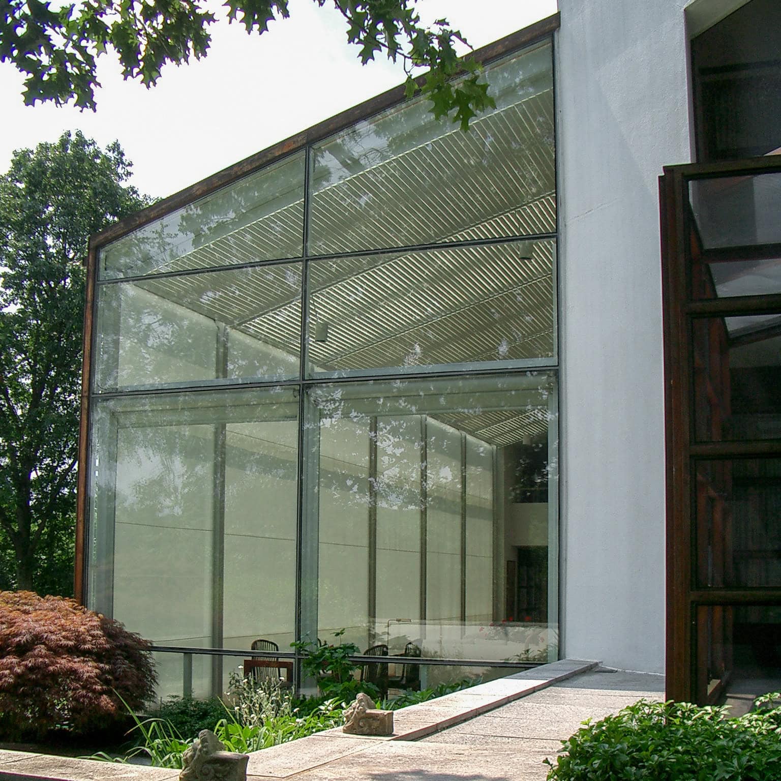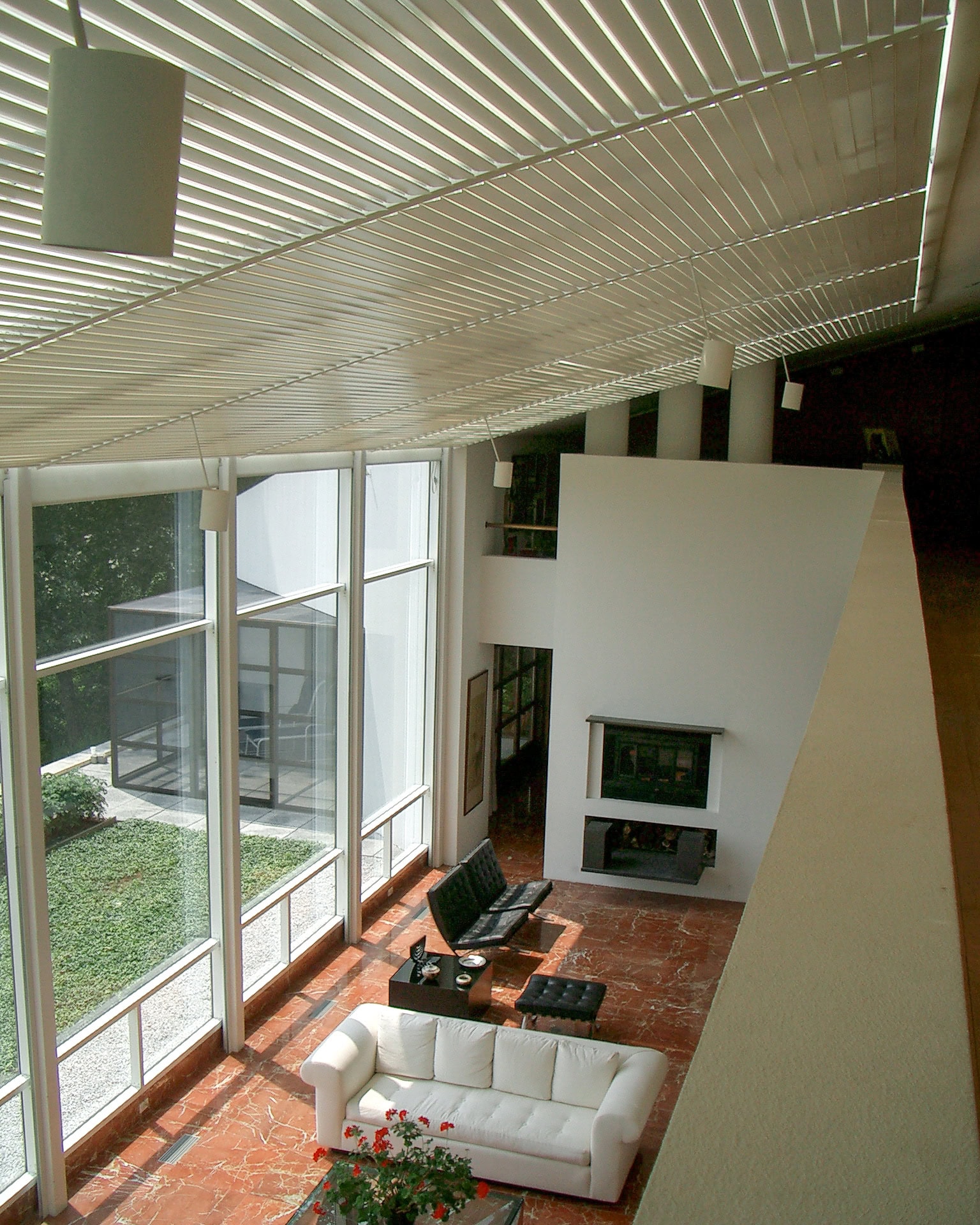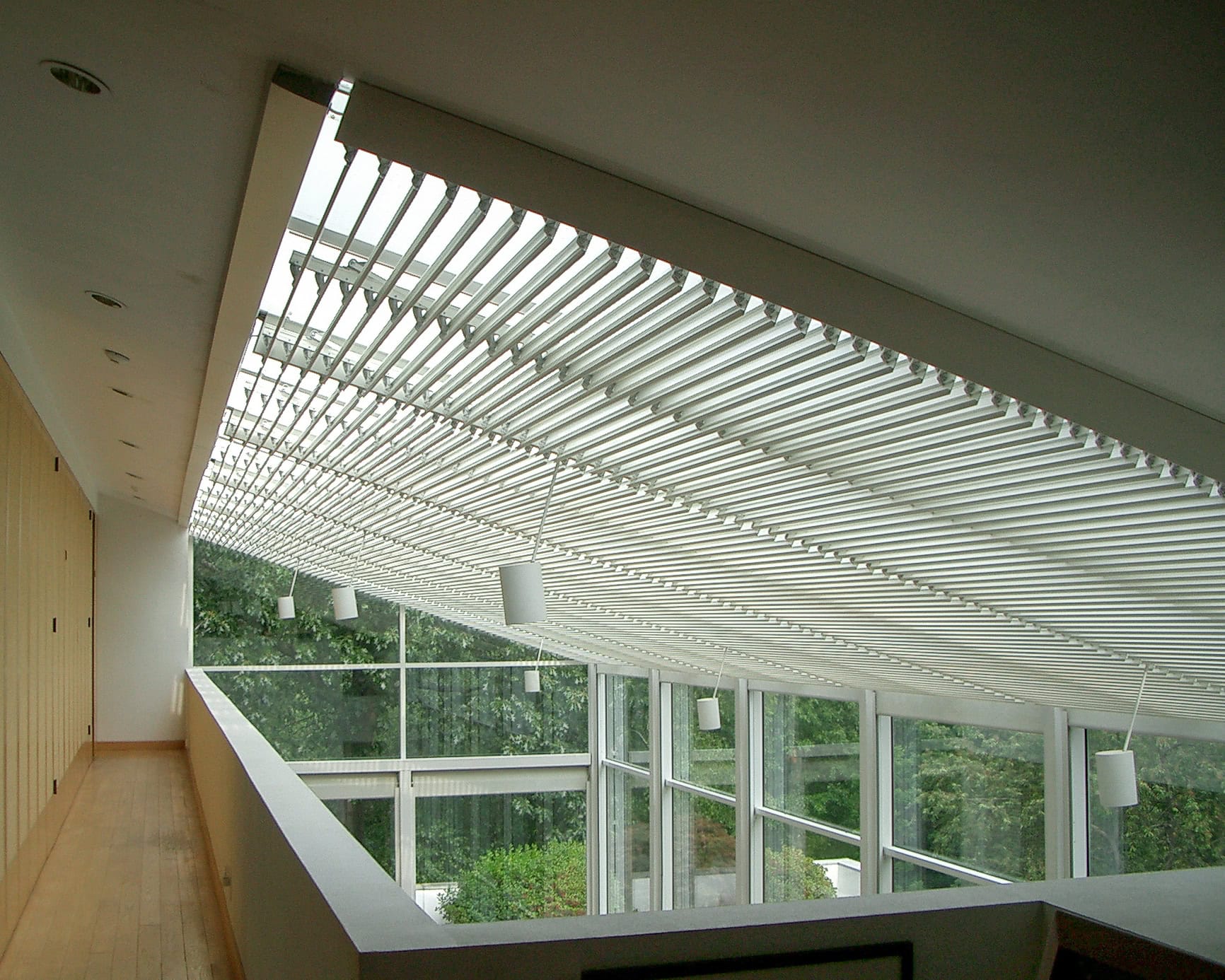 In opdracht van deze architect is het grote glasdak van de serre aan de binnenzijde voorzien van kantelbare lamellen. De gebruikers zetten de lamellen eenvoudig in elke gewenste stand tussen helemaal open en helemaal dicht. Op deze wijze reguleren zijn inkomend zonlicht en -warmte.