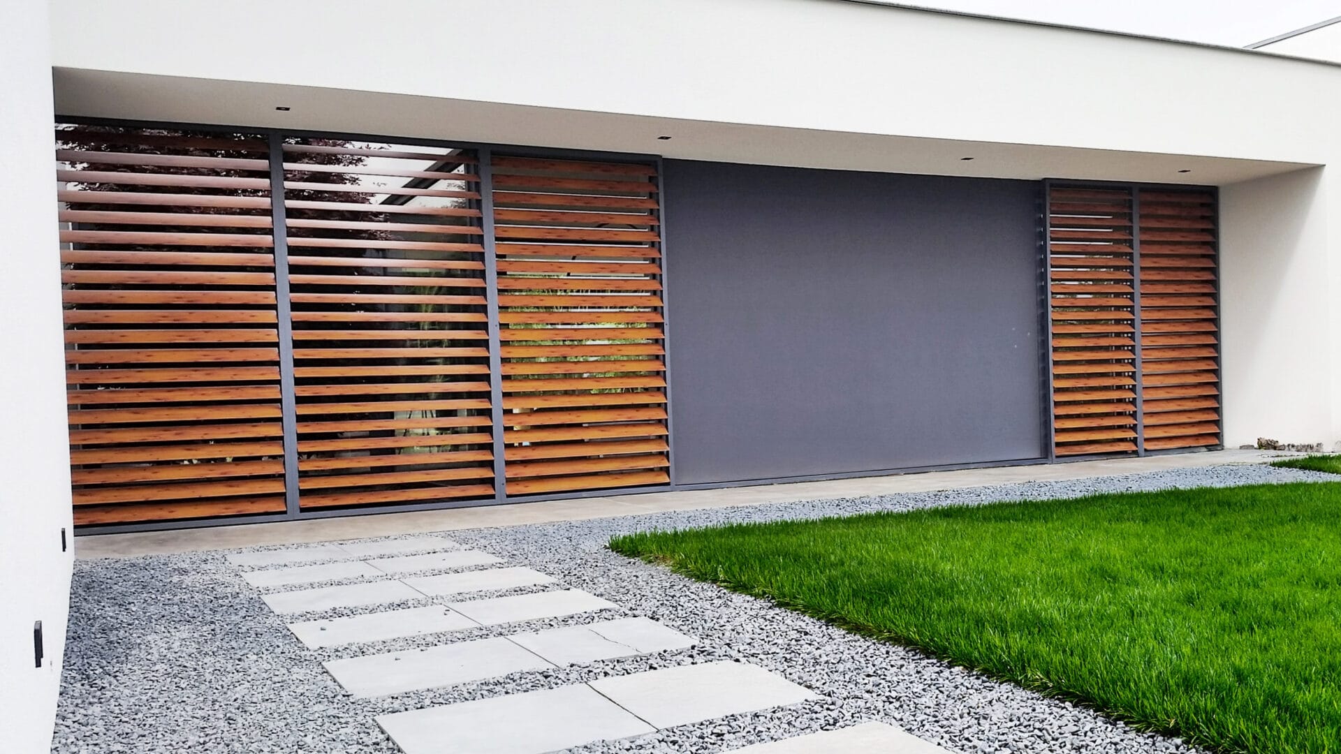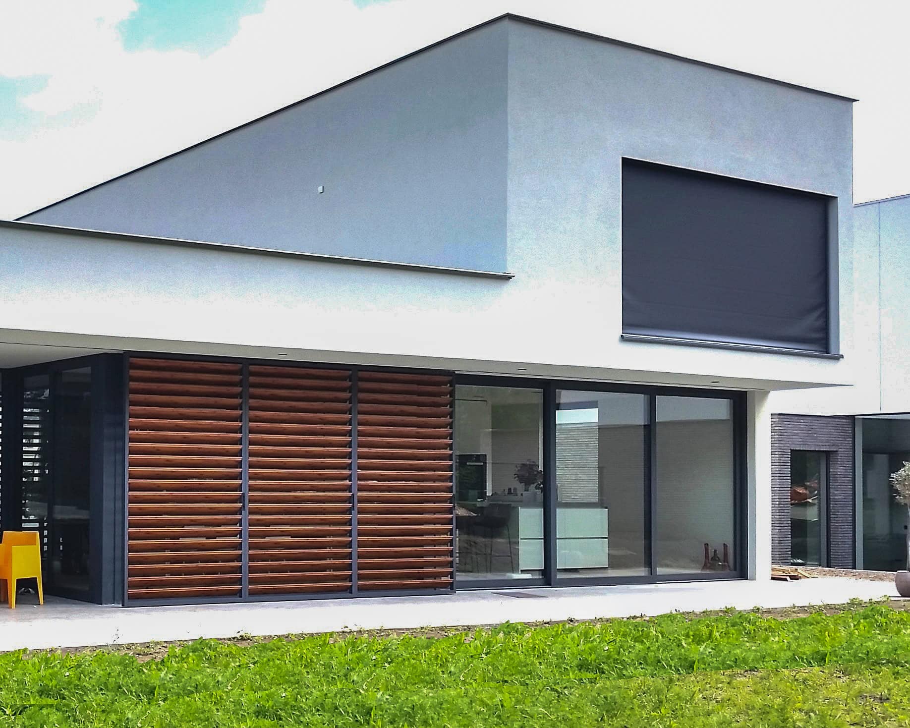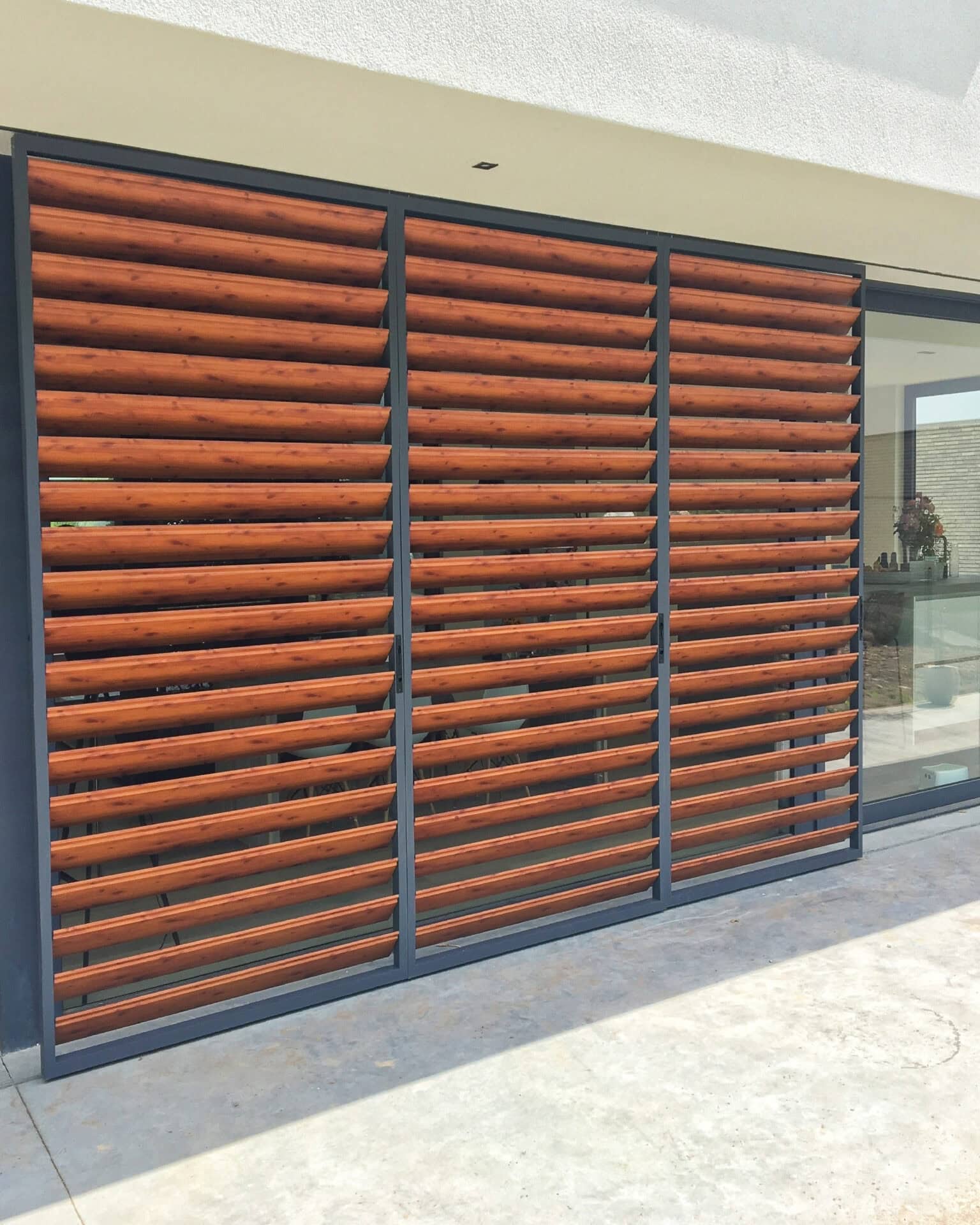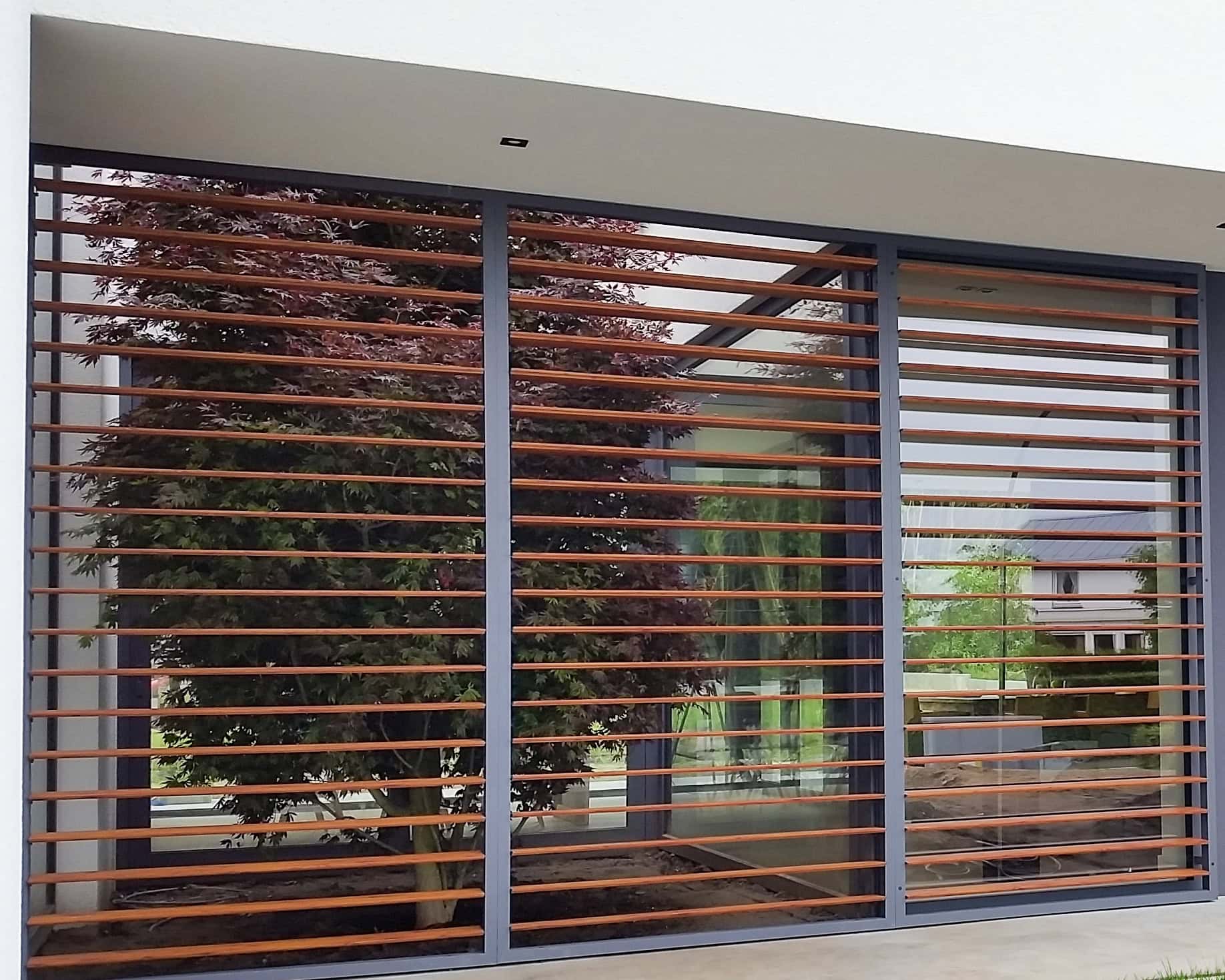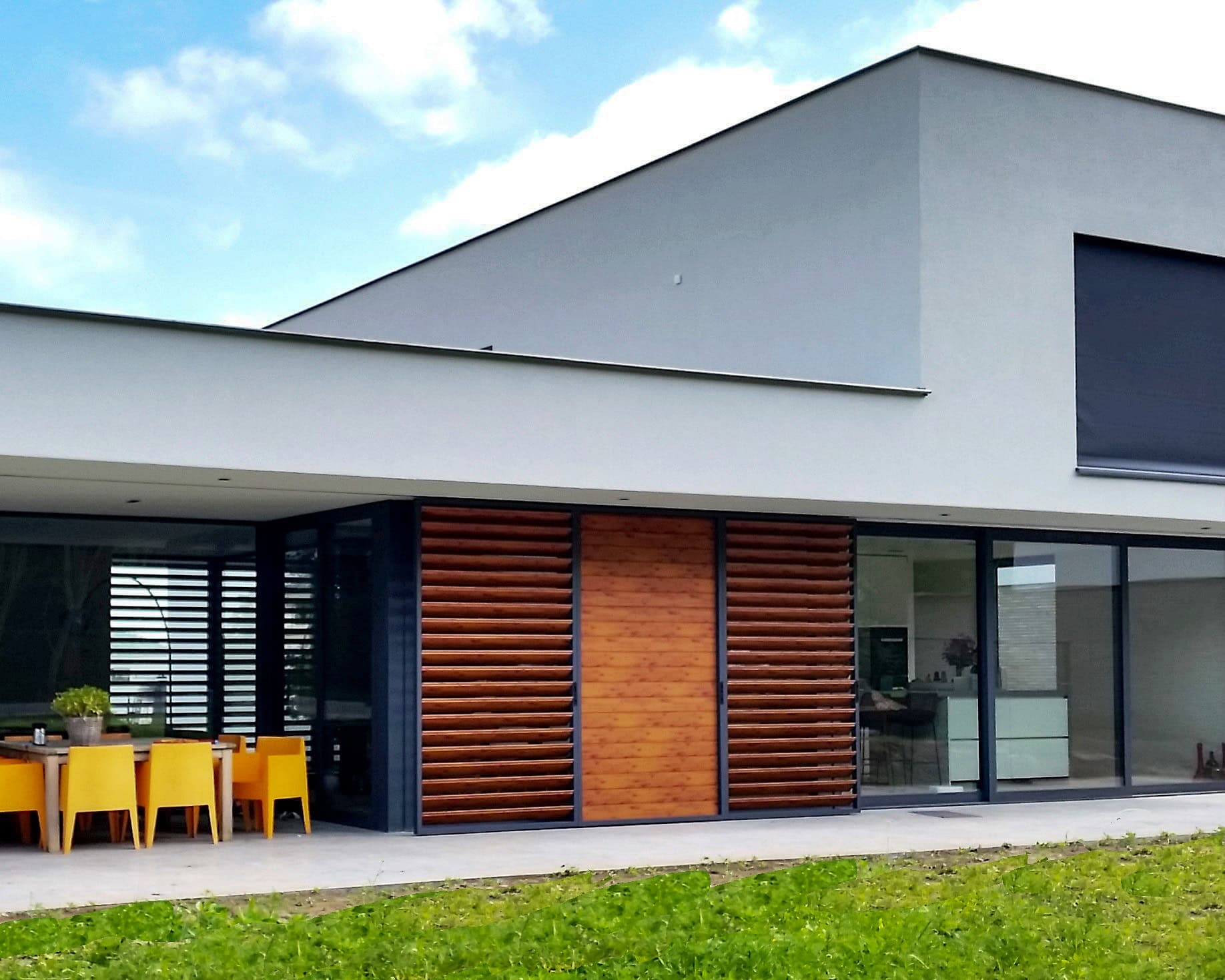 Door de aannemer zijn aan terraszijde in vloer en plafond 18 meter lange rails geplaatst. Aansluitend zijn de panelen ingemeten, geproduceerd en geplaatst. De schuifpanelen zijn anderhalve meter breed en kunnen voor de gehele gevel langs verschoven worden. Aan de achterzijde zijn nog eens vijf vaste panelen geplaatst. Alle lamellen zijn kantelbaar en uitgevoerd in houtlook.