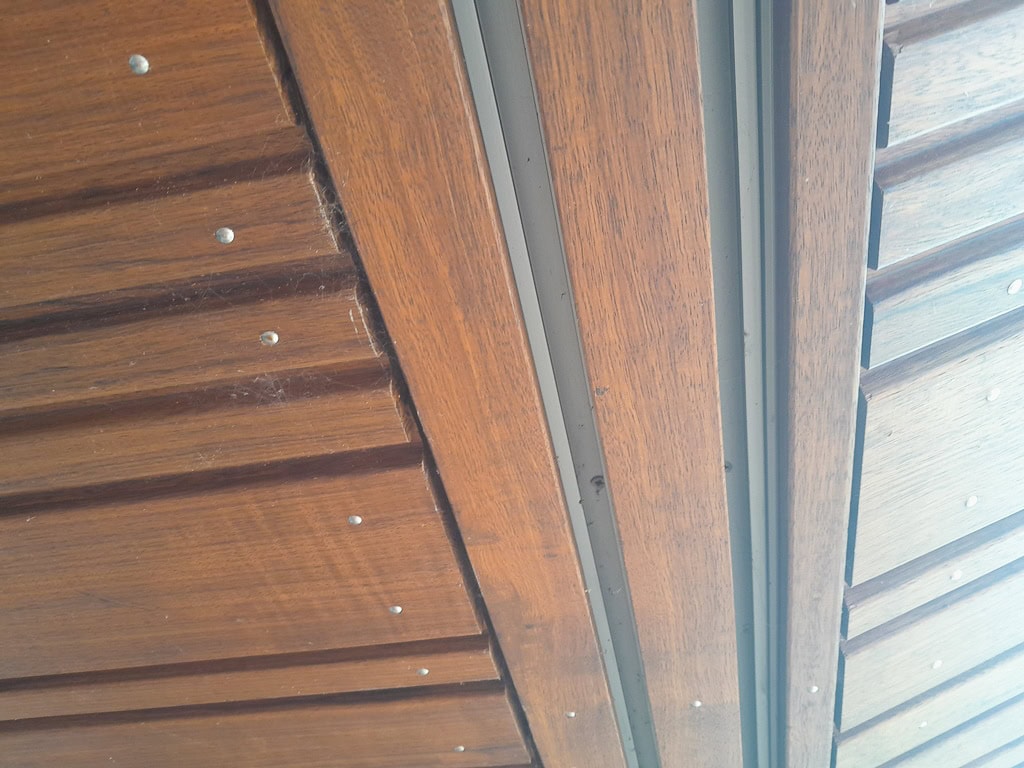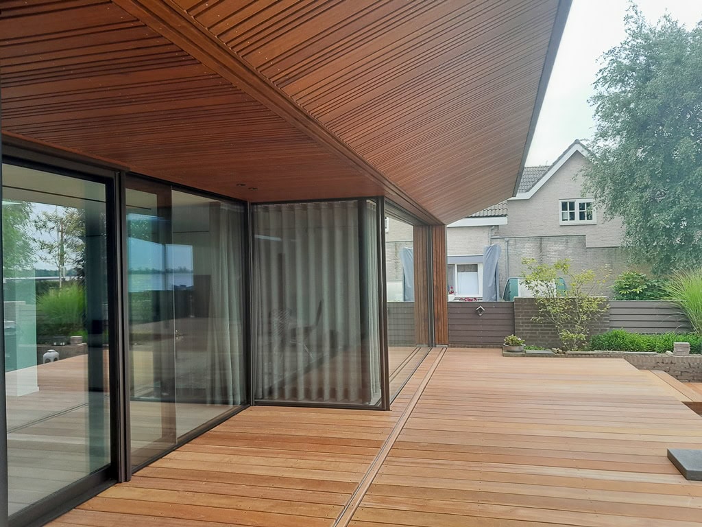 De dubbele geleiderails in de overstek en vloer zijn aangebracht door de aannemer. Daarna kon worden ingemeten voor de twee schuifpanelen. Deze schuifpanelen kunnen naar wens op elke positie aan de gevel worden vastgezet en schuiven vrijelijk voor elkaar langs. Hier is gekozen voor de ellipsvormige EL145 louver. Kader en lamellen zijn uitgevoerd in zwart met fijnstructuur.