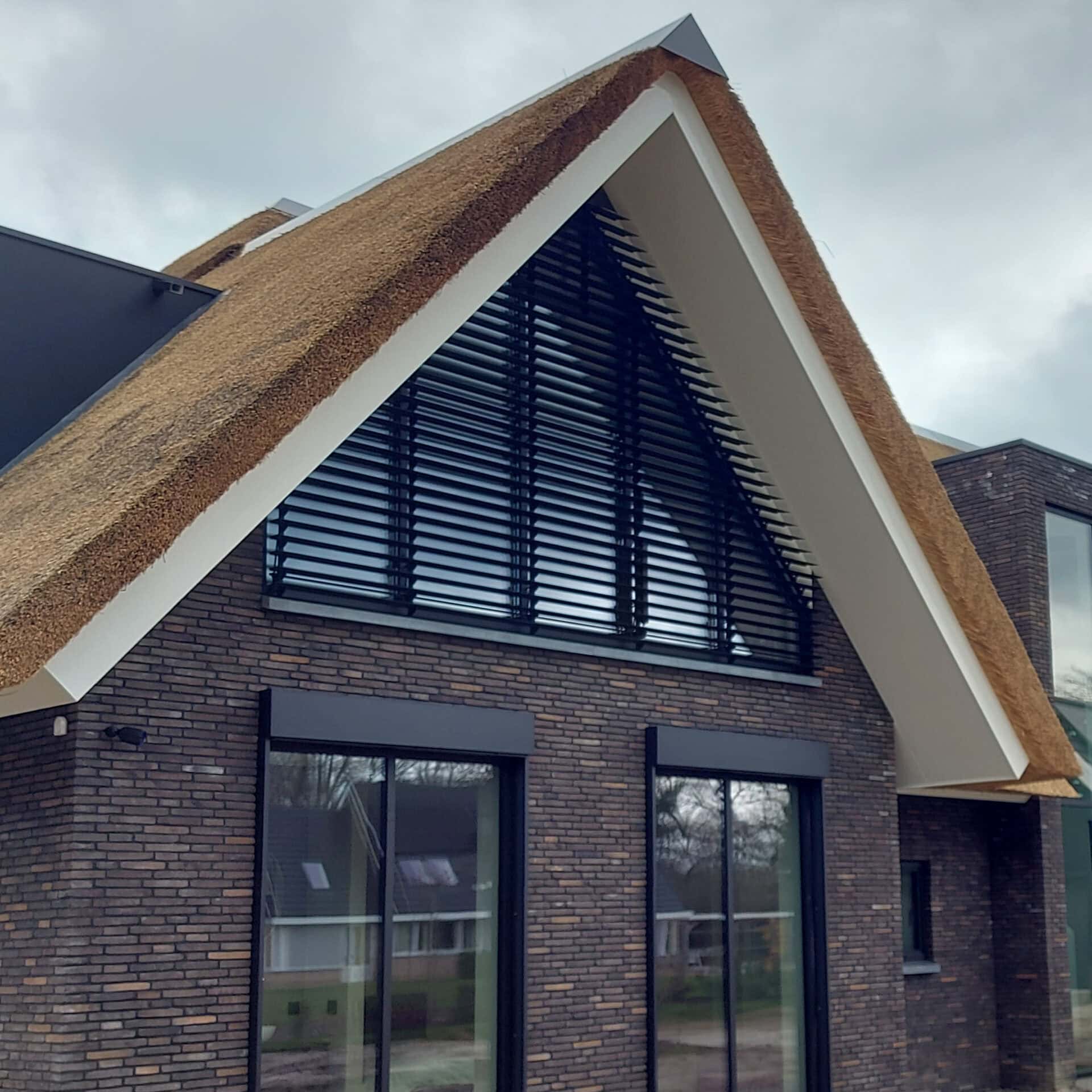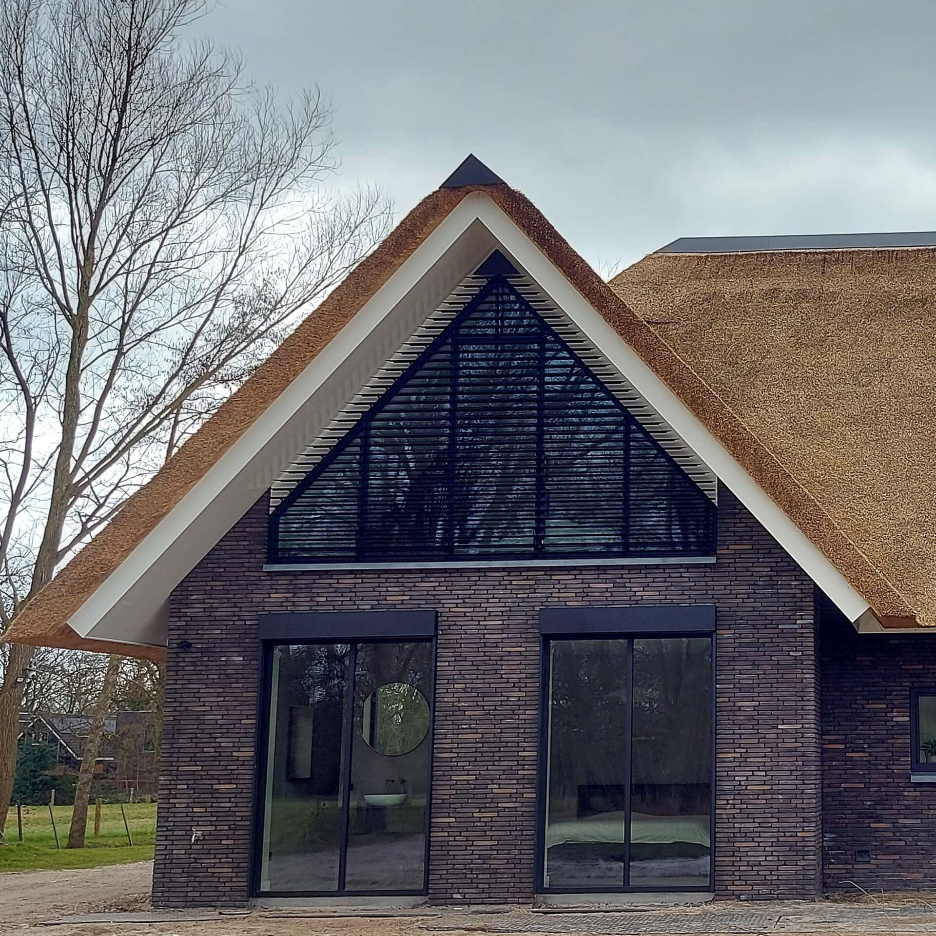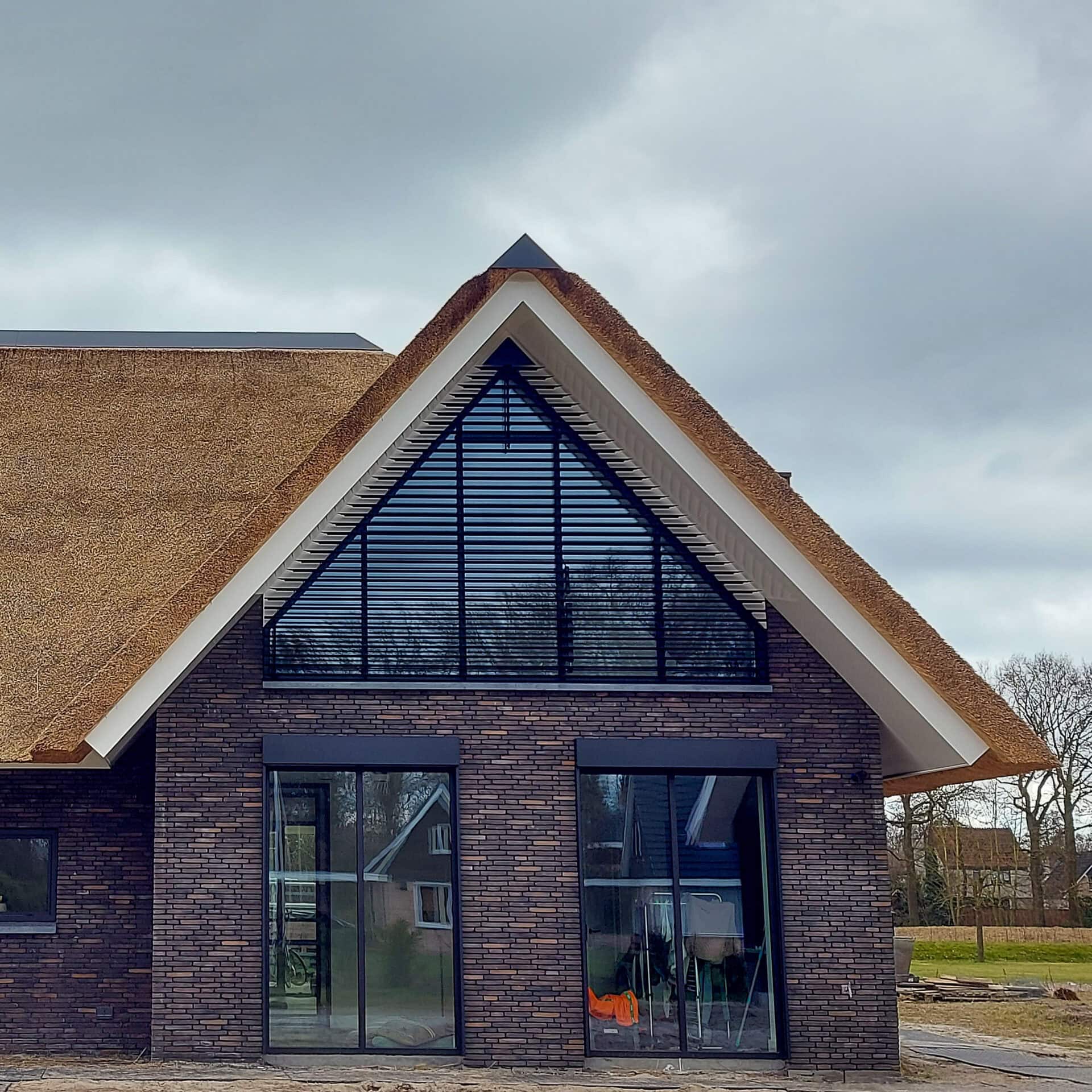 Deze villa heeft vier topgevels. Bij de grote ramen in deze façades zijn in totaal vijf lamellensystemen geplaatst. Twee aan de voorgevel en drie aan de achtergevel.