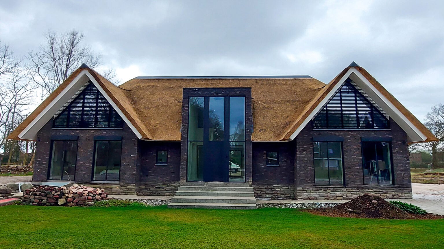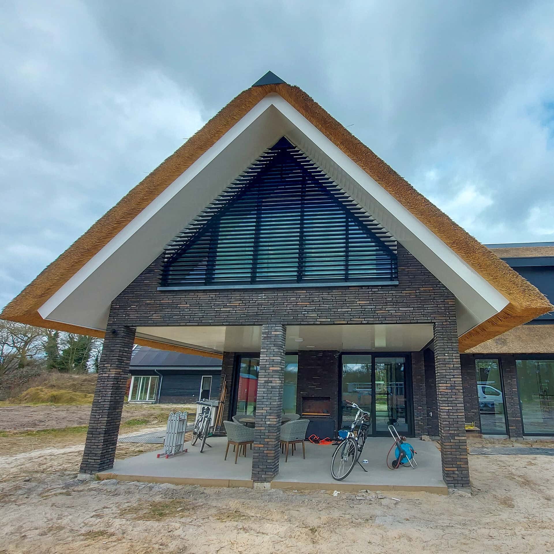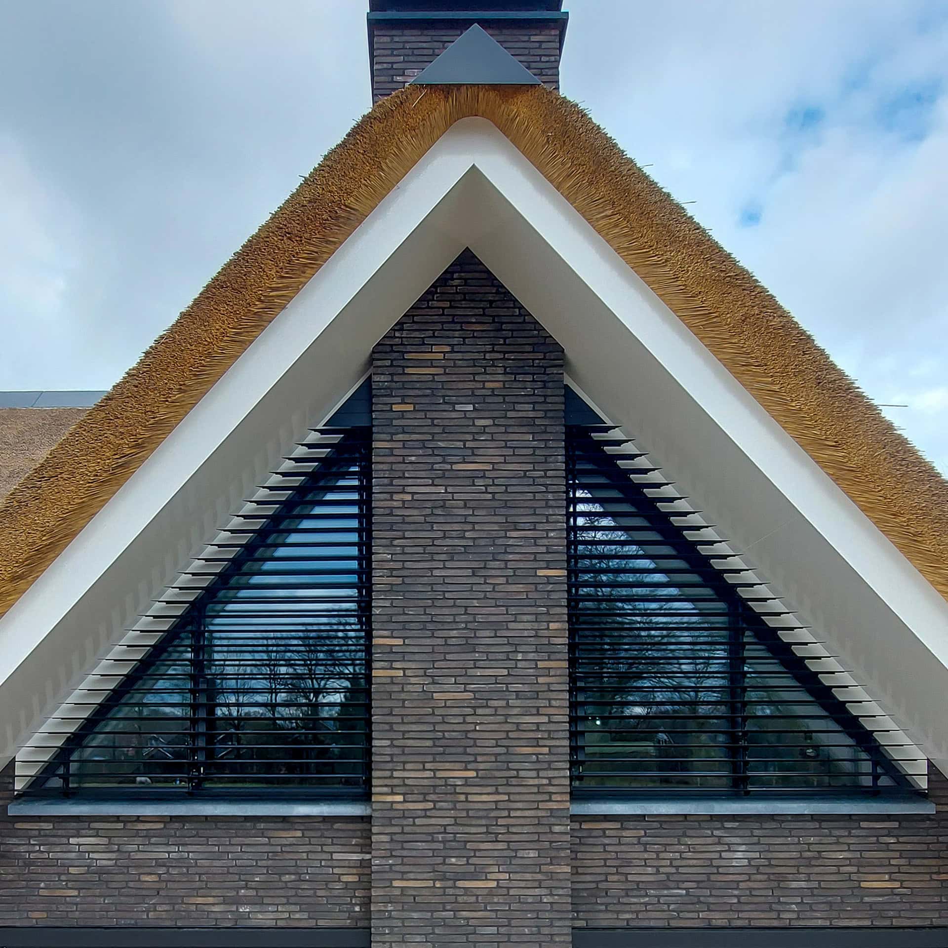 Deze villa heeft vier topgevels. Bij de grote ramen in deze façades zijn in totaal vijf lamellensystemen geplaatst. Twee aan de voorgevel en drie aan de achtergevel.