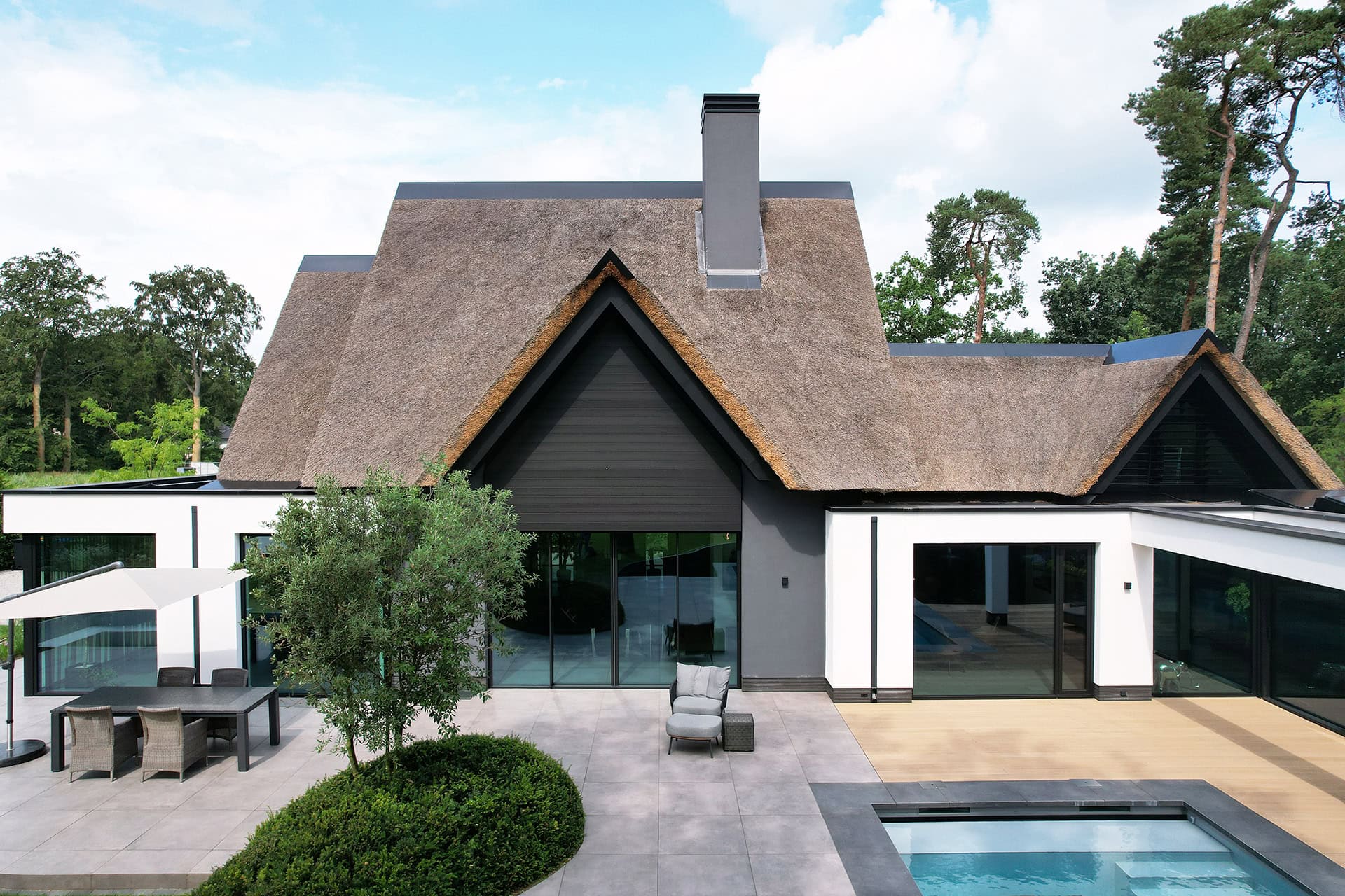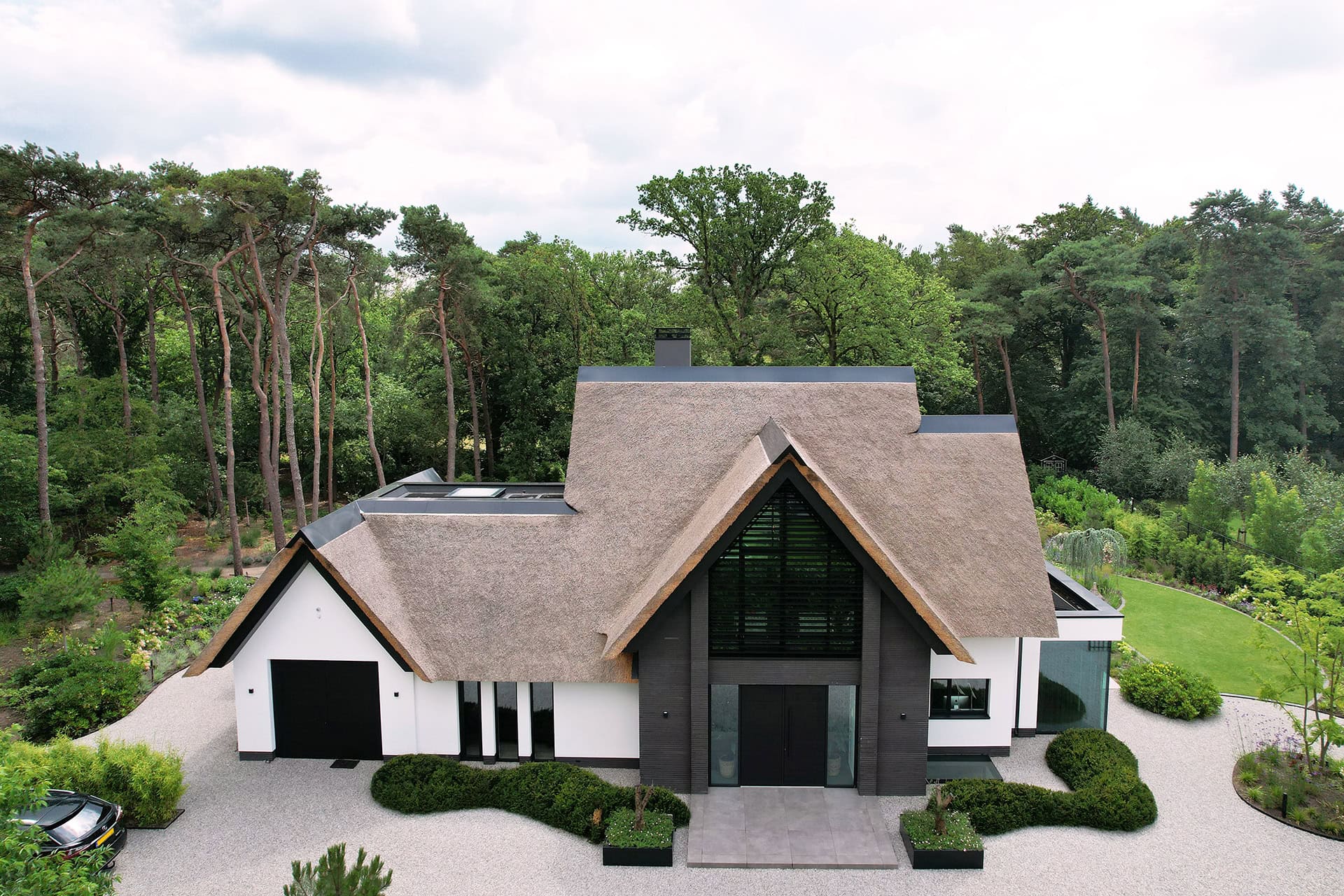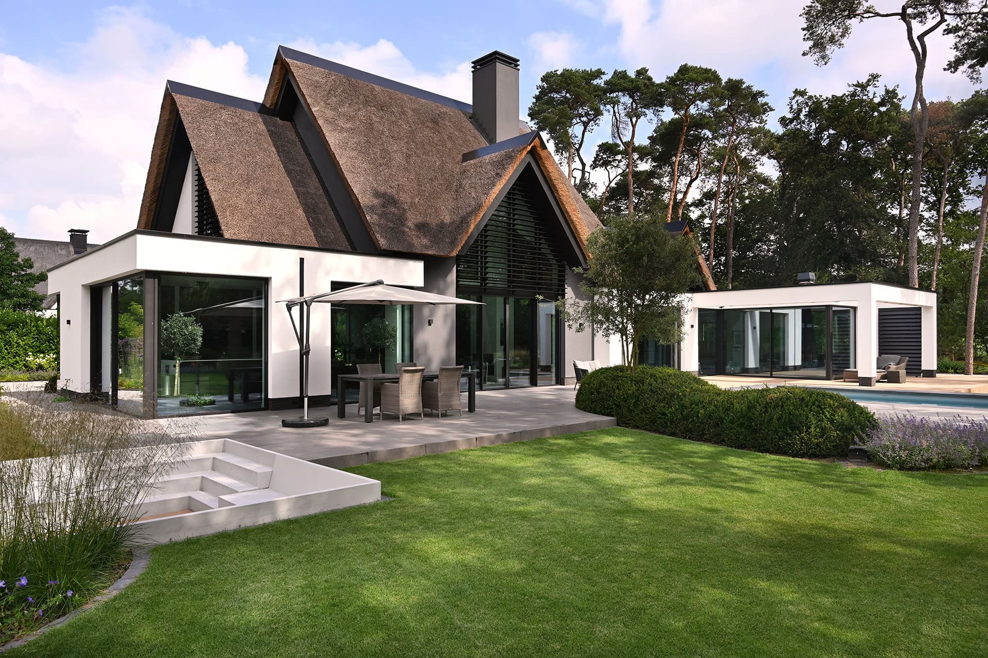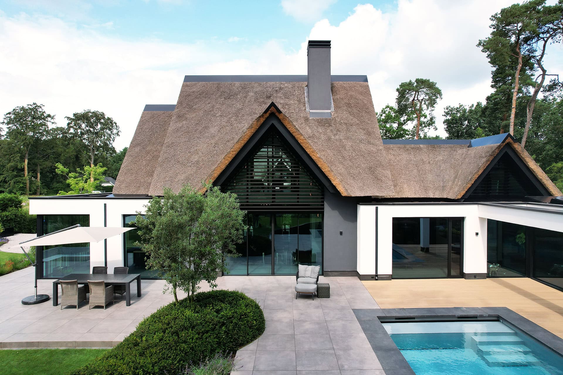 De Utrechtse Heuvelrug herbergt het op een na grootste bosgebied van Nederland. De gemengde bossen en glooiende heuvels garanderen buitenplezier ongeacht het seizoen. Hier is een moderne villa voorzien van unieke louvers. Door Sunshield, in opdracht van Habé Bouwen in Stijl in Lunteren. Dit prachtige landhuis is gerealiseerd naar een ontwerp van architect Paul Tesser.