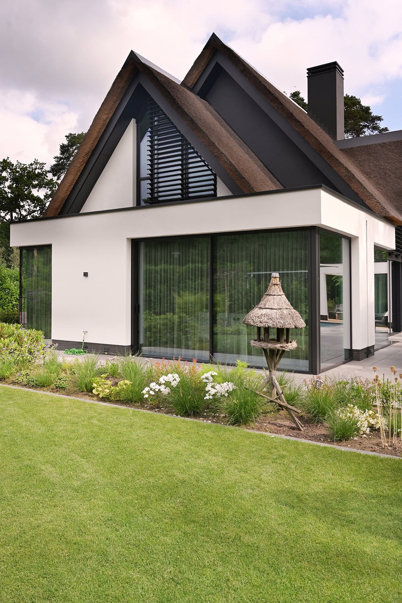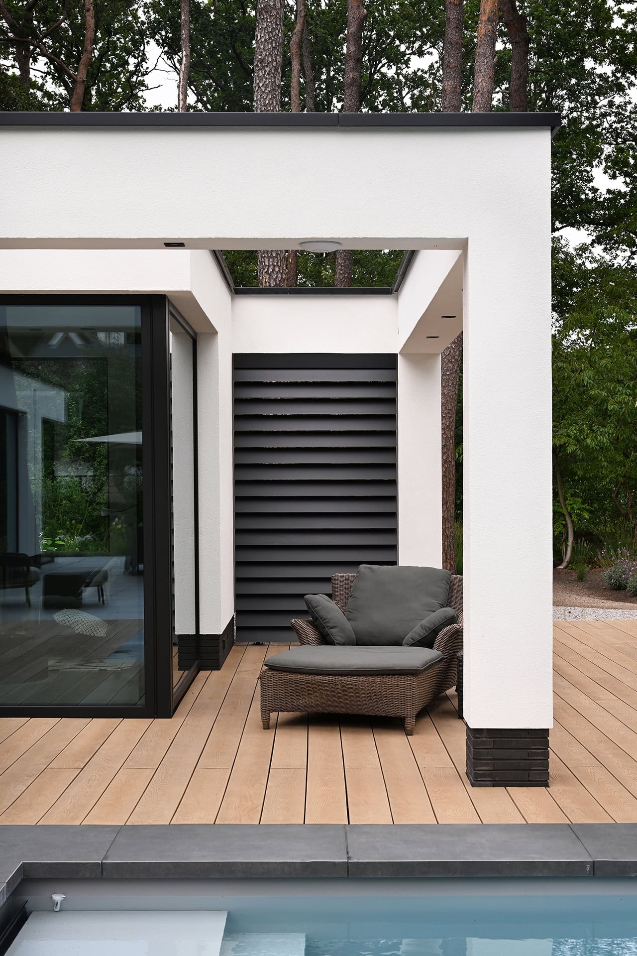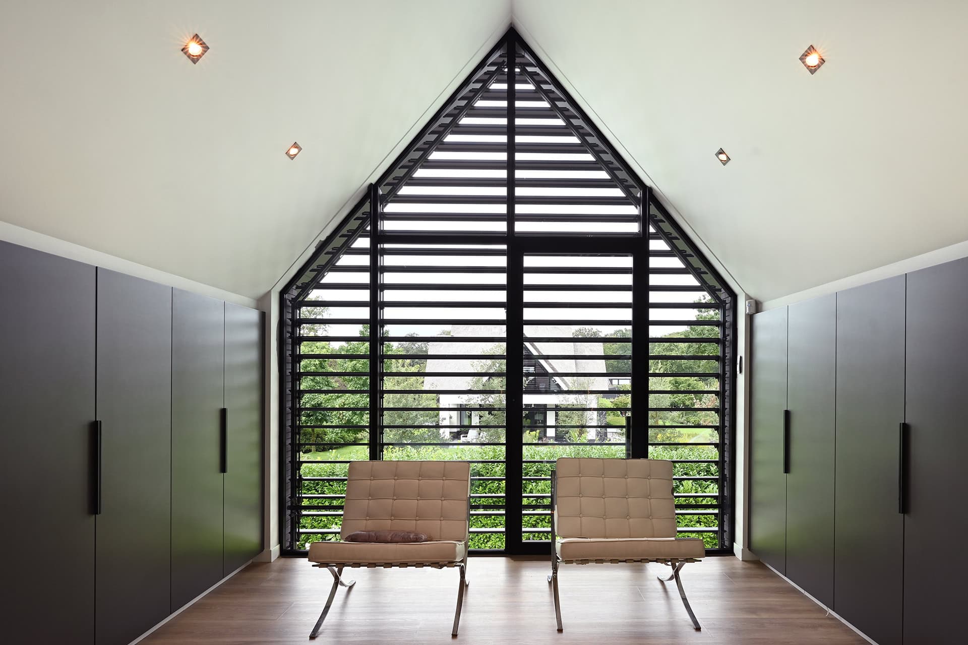 Aan de achtergevel zijn twee lamellensystemen geplaatst. Boven de schuifpui is een rechthoek/driehoek geïnstalleerd en aan de topgevel ernaast een driehoekig louver systeem.