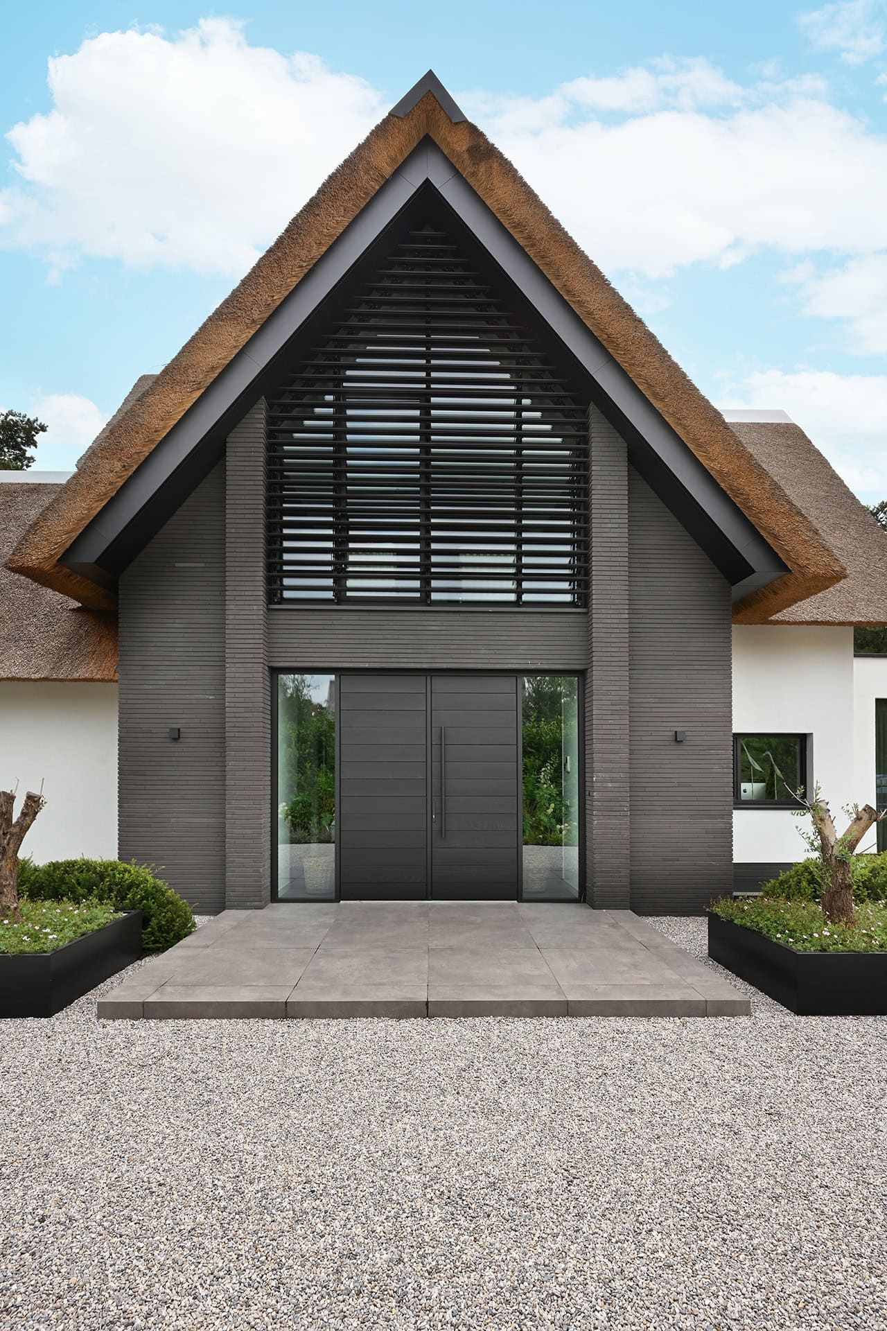Boven de entree is een louver systeem van circa 10 m2 geplaatst. De onderste helft van het systeem is rechthoekig, het bovenste deel eindigt met een punt in de nok van het dak.
