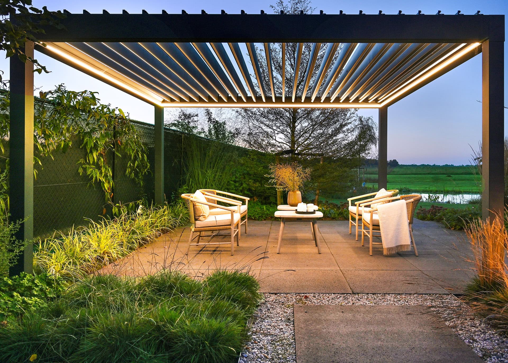 Een functioneel lamellendak dat op zichzelf in de tuin kan staan. De lamellen kunnen open en dicht kantelen. Als ze dicht zijn zit men helemaal droog. Dit lamellendak is ook uitgerust met ledverlichting om het ‘s avonds aangenaam te maken om onder te zitten.