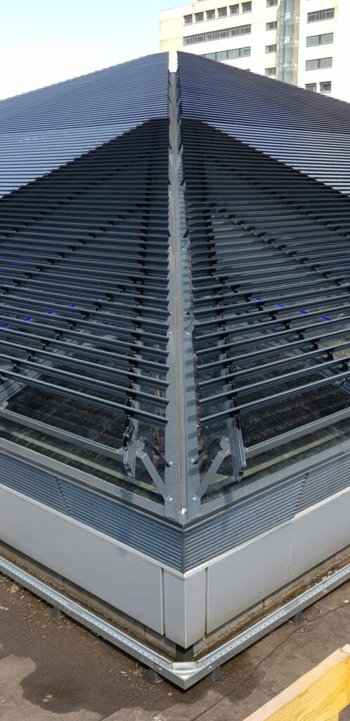 De unieke drager systemen van Sunshield volgen de contouren van raam en gevel. Ook de lamellen volgen nauwgezet de lijnen uitgezet door de architect.