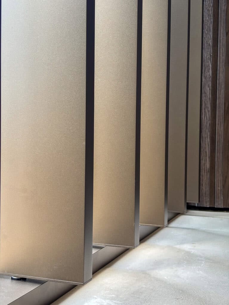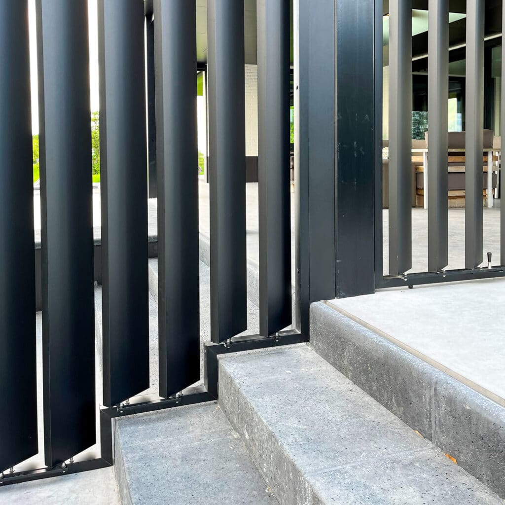 Applicaties van het Elegance gamma worden vooral met kantelbare lamellen uitgevoerd. De verticale lamellen worden op locatie in een kader geplaatst.